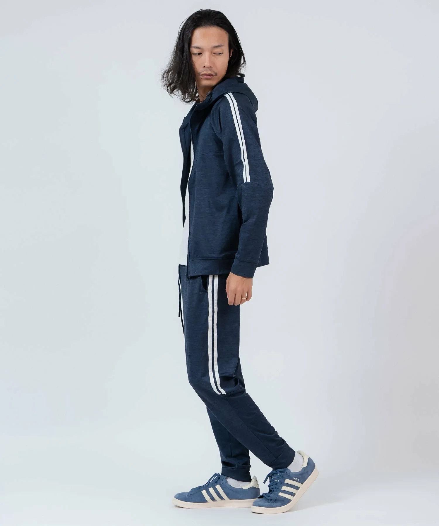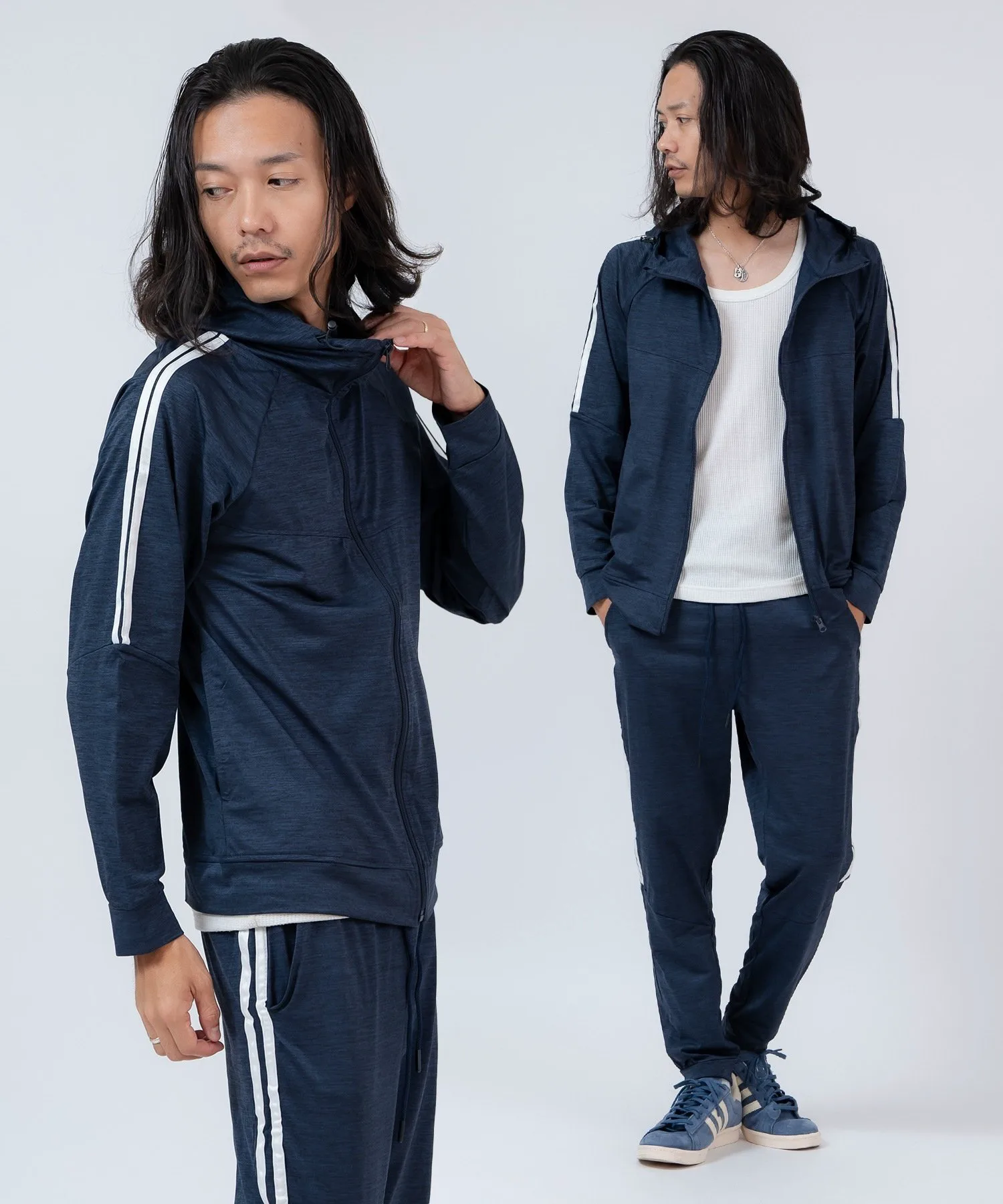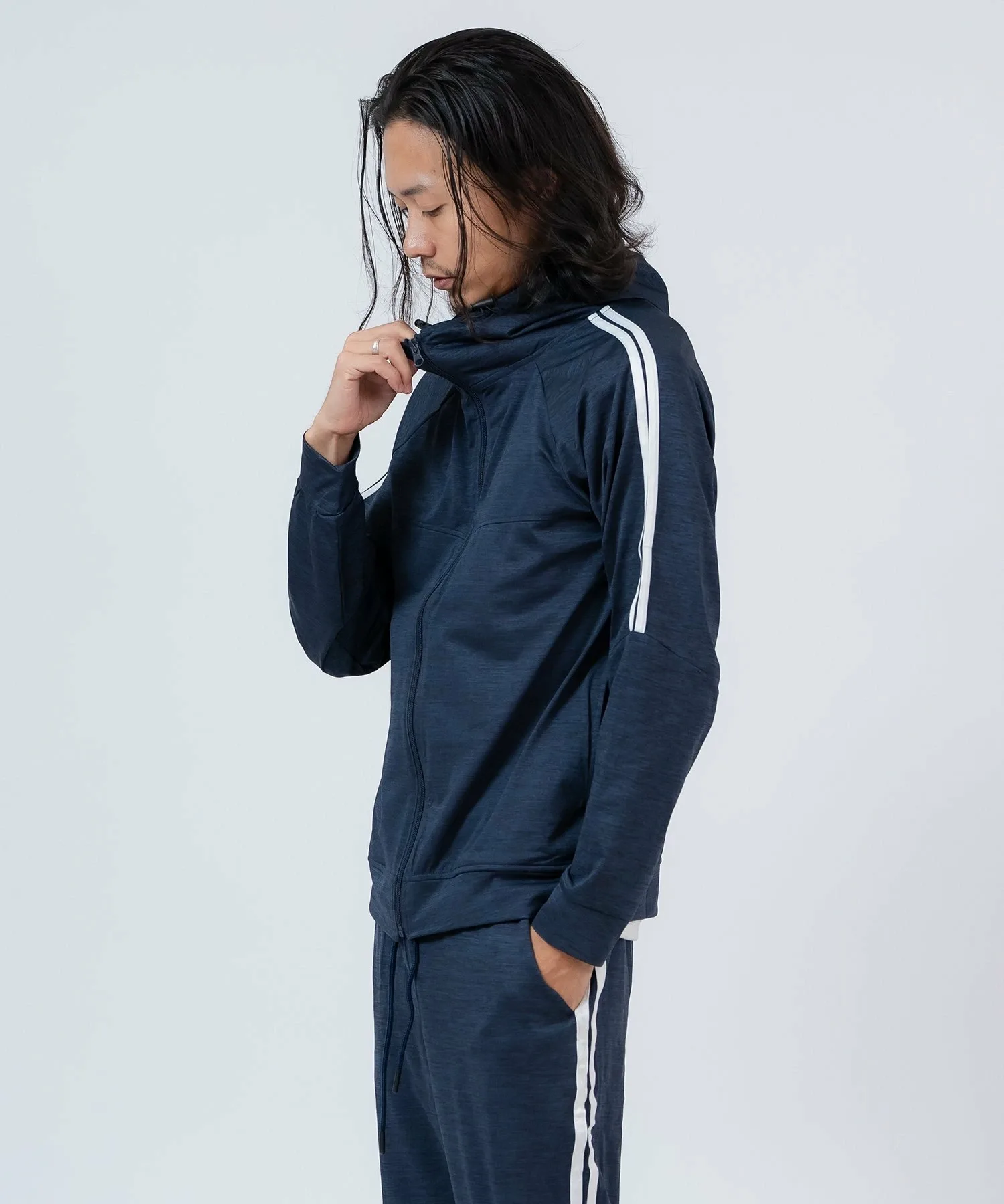 ●Комплект из верха и низа, состоящий из толстовки на молнии с модными боковыми полосками и спортивных брюк с ребристым низом для аккуратного вида.