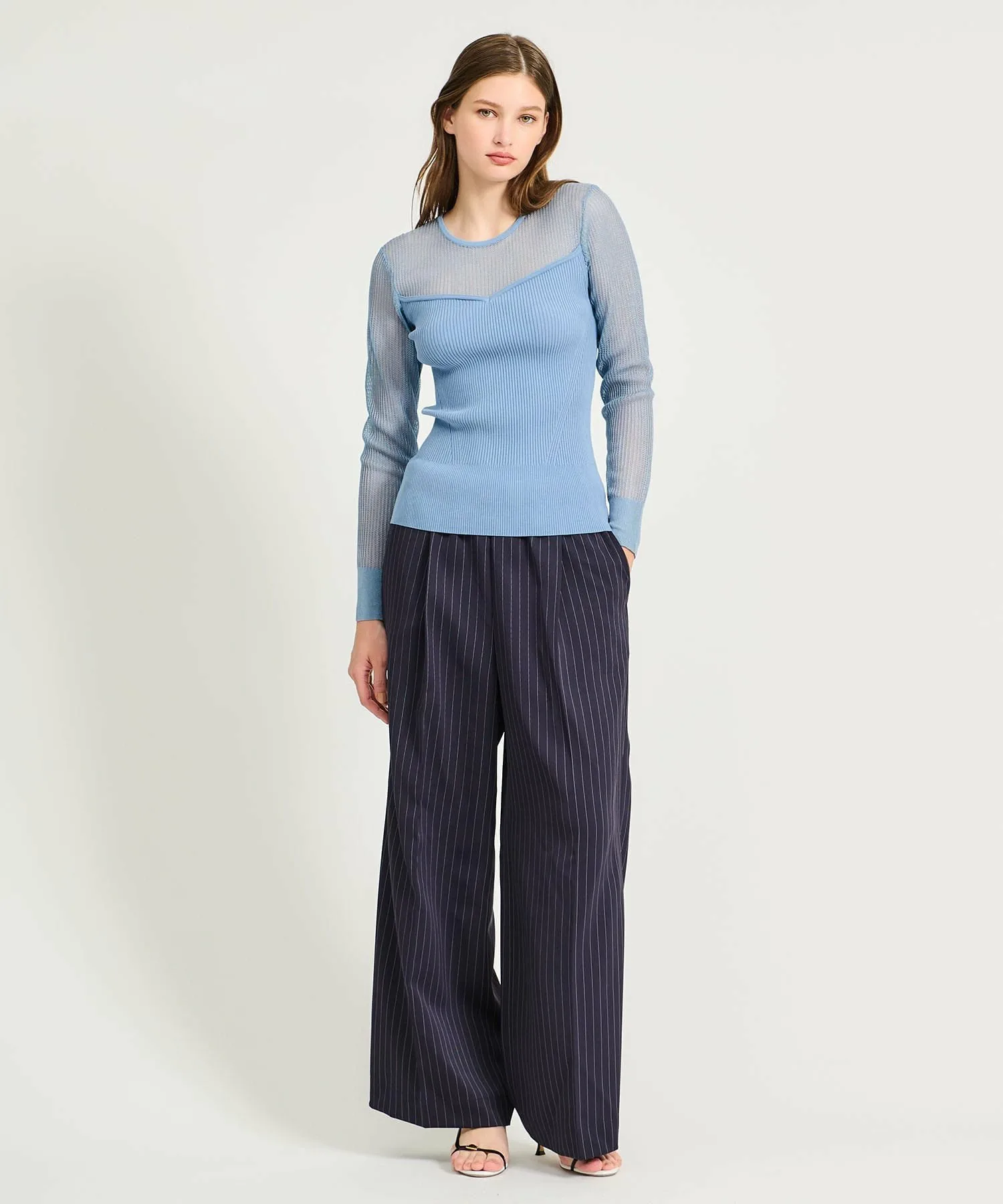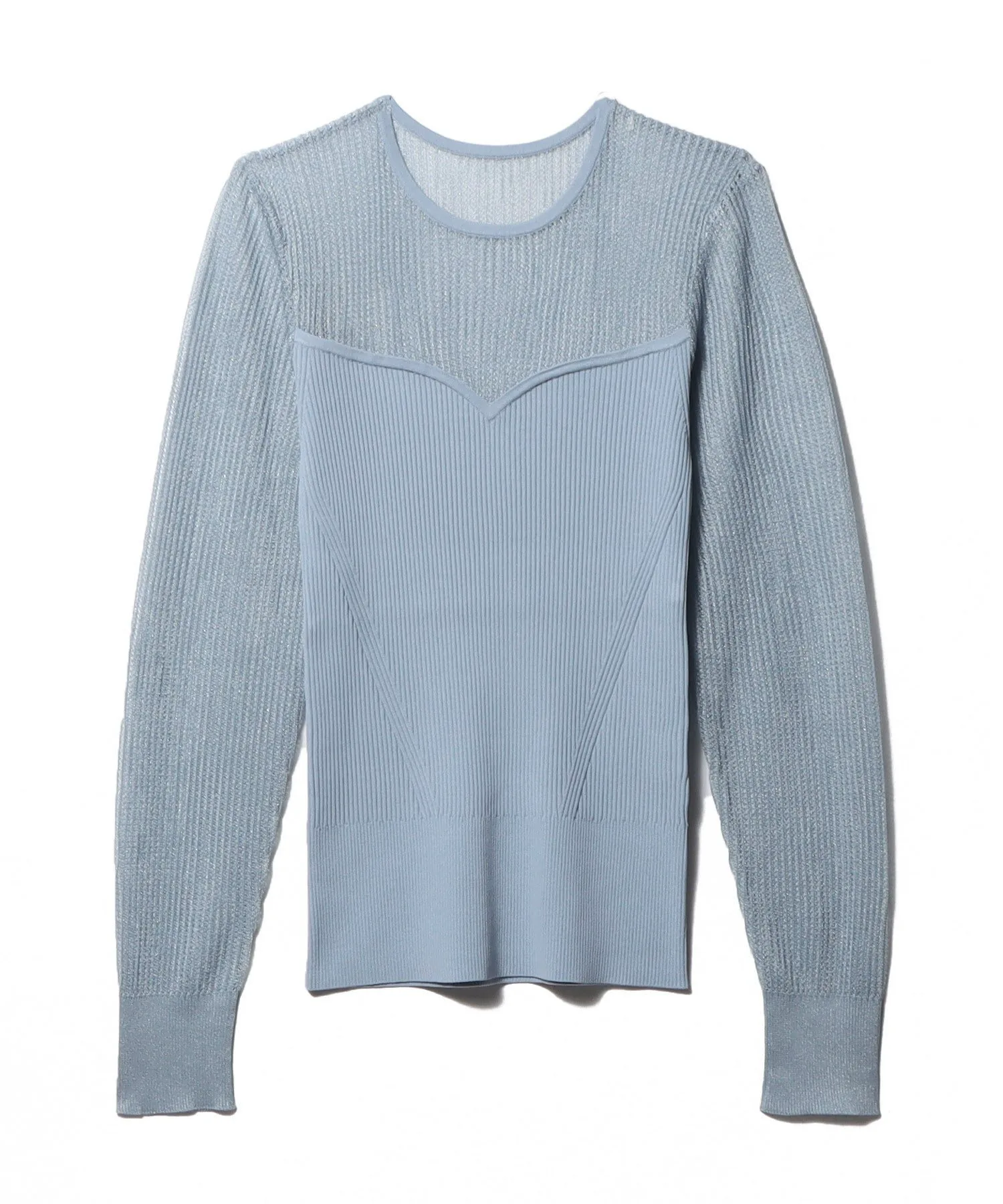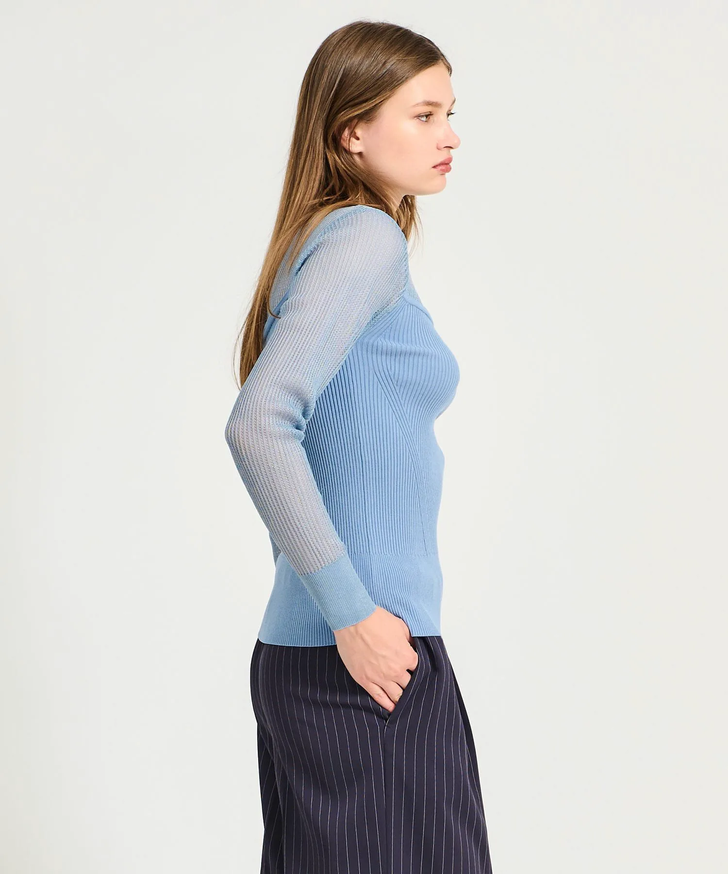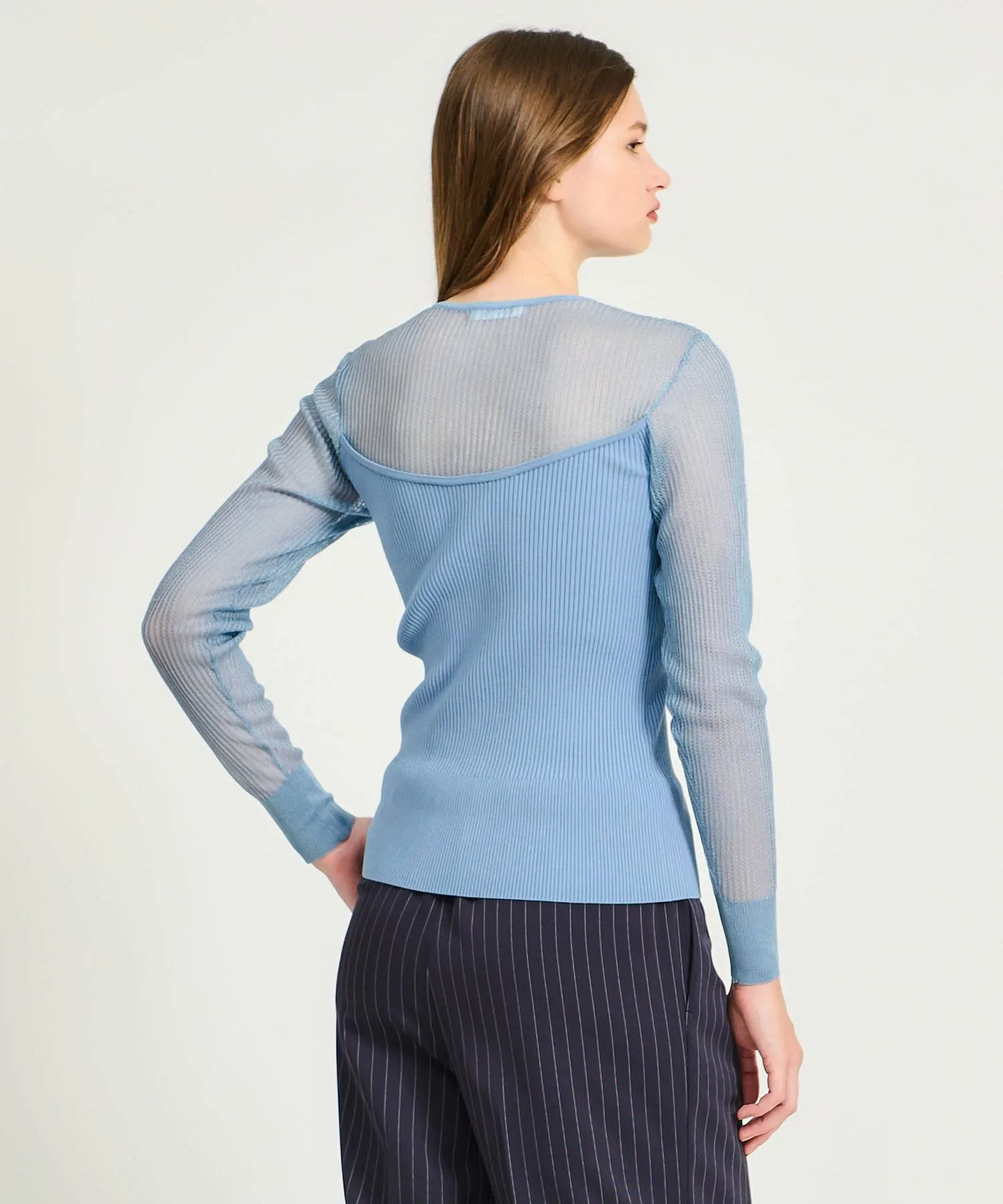 Трикотажное изделие, изготовленное из комбинации различных материалов, на основе вискозно-полиэстеровой ребристой вязки, обеспечивает комфортную посадку и имеет прозрачный ажурный узор на кокетке и рукавах.