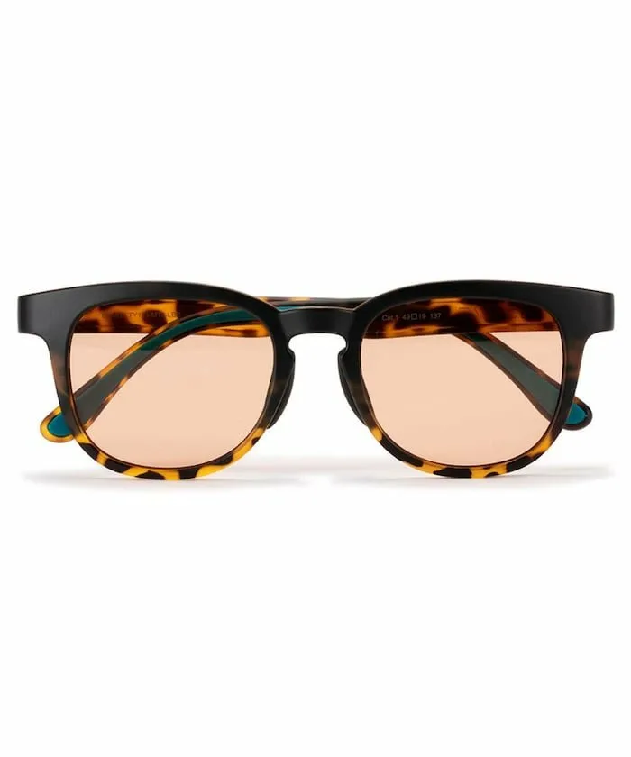 Оправа выполнена из черепахового панциря, линзы светло-коричневые, чтобы уменьшить блики и подчеркнуть цвет глаз.