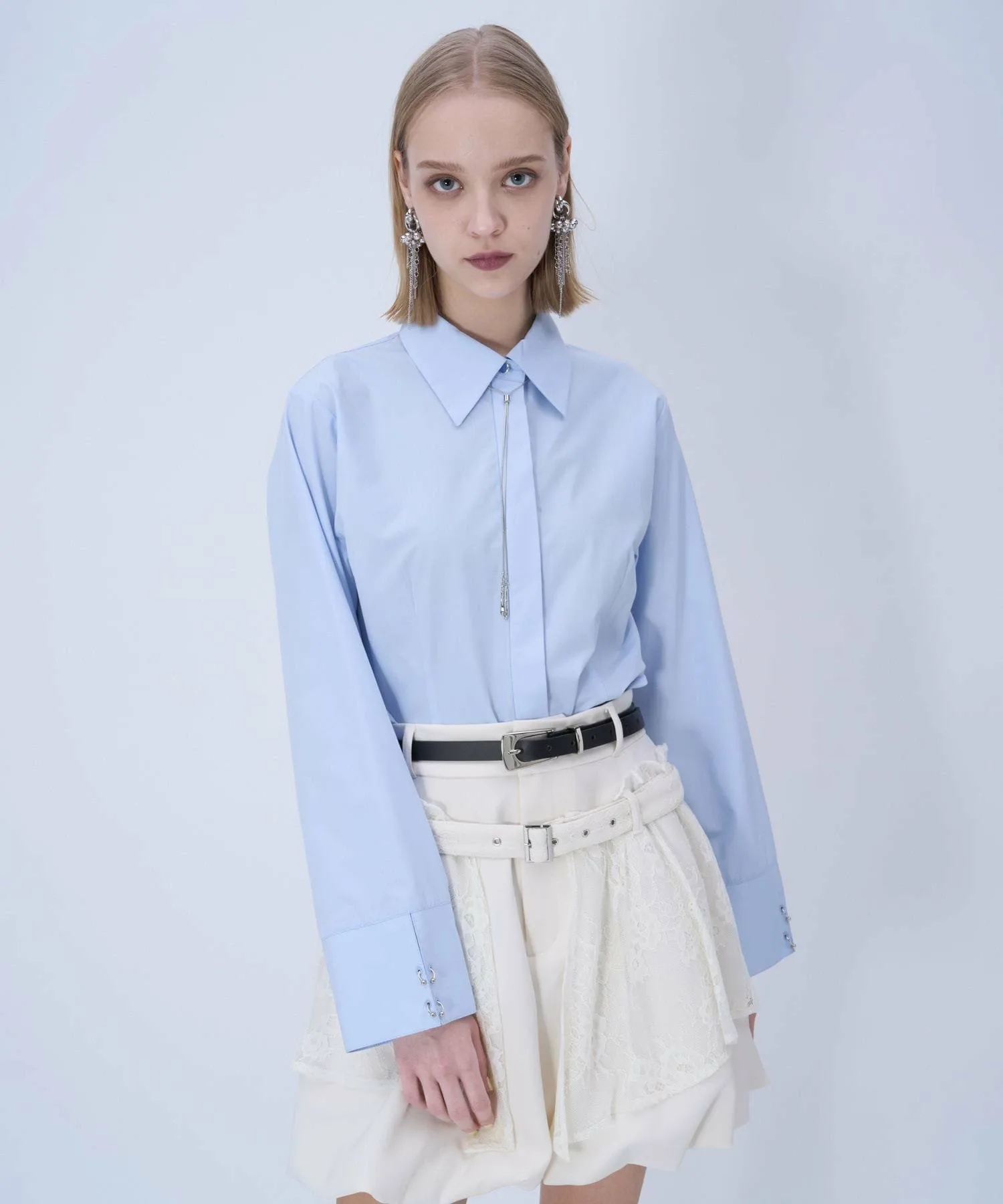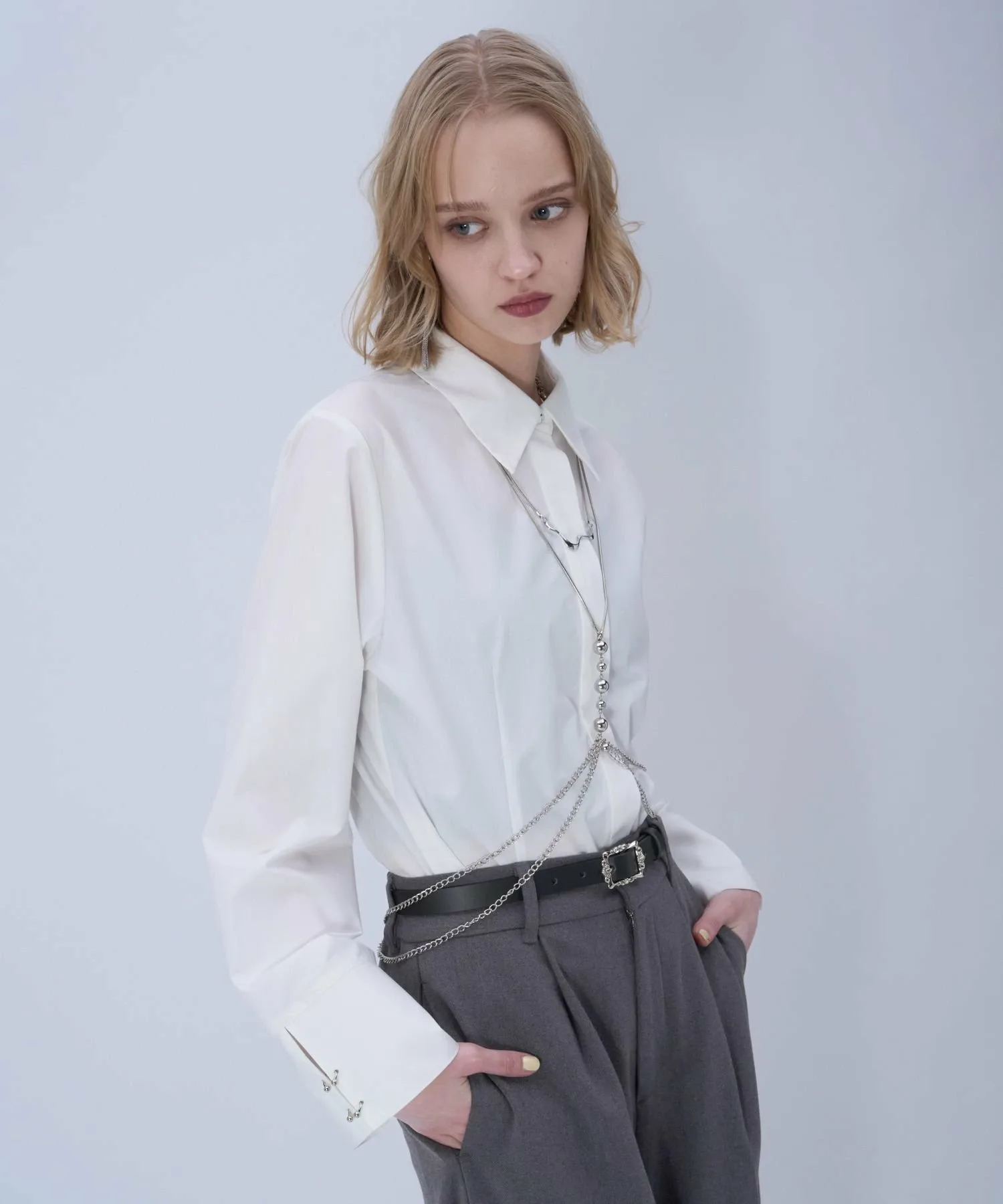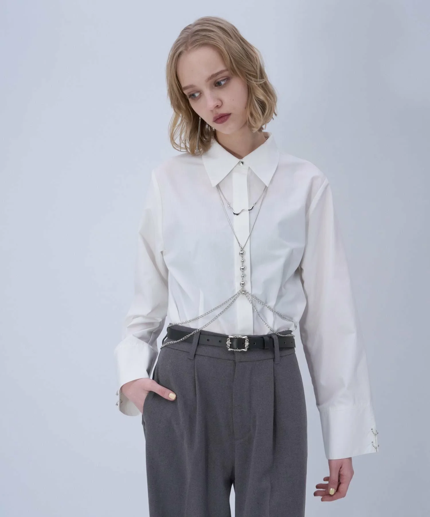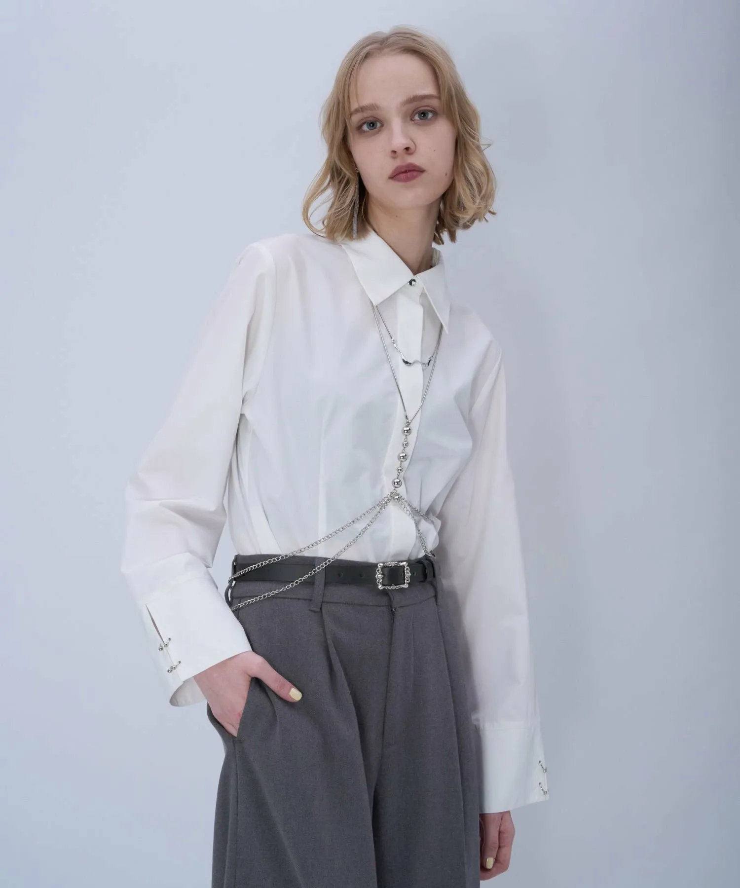 Простая, но модная рубашка с серьгами-гвоздиками на рукавах в качестве изюминки.
