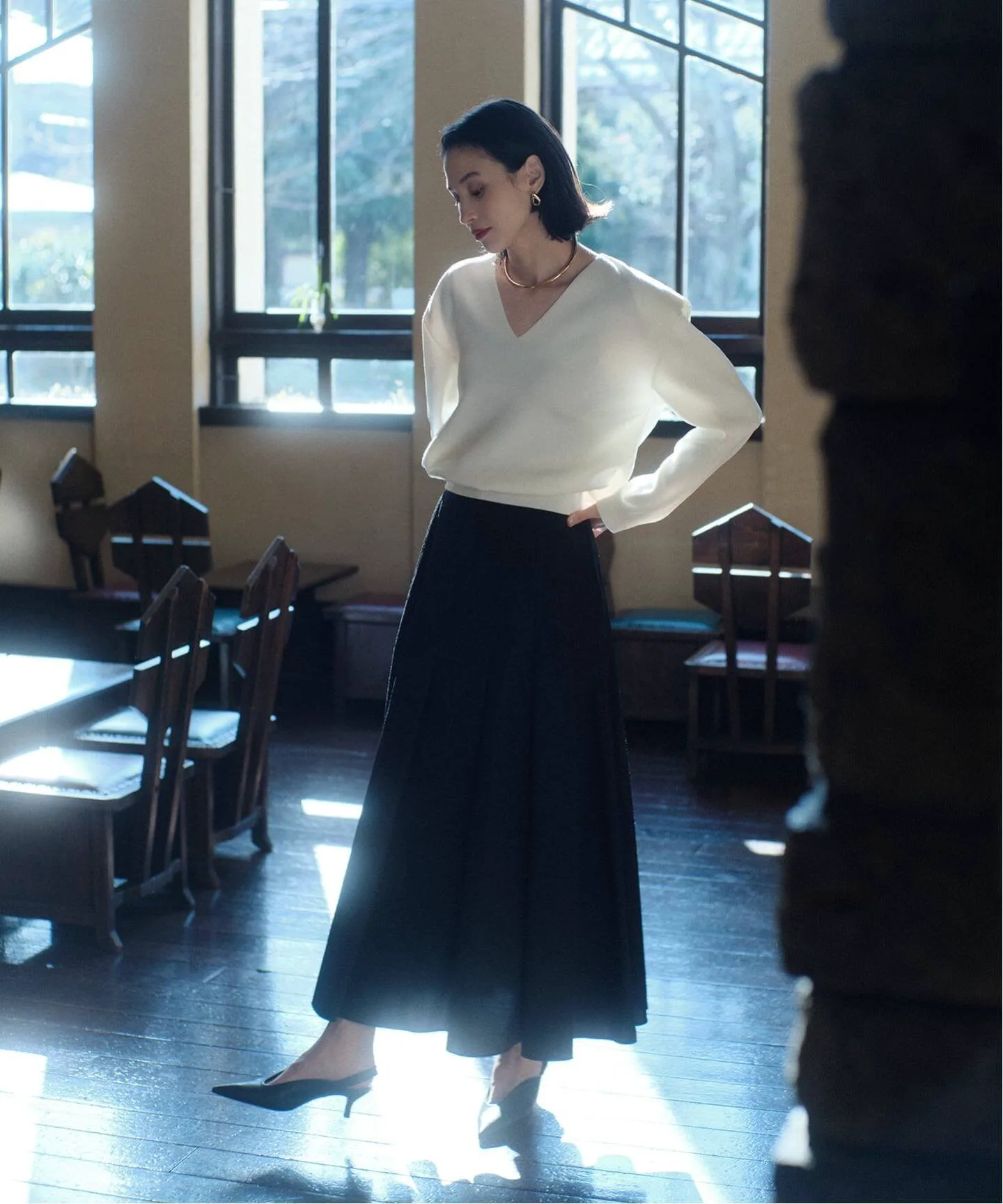 Нежный V-образный вырез подчеркивает женственность.