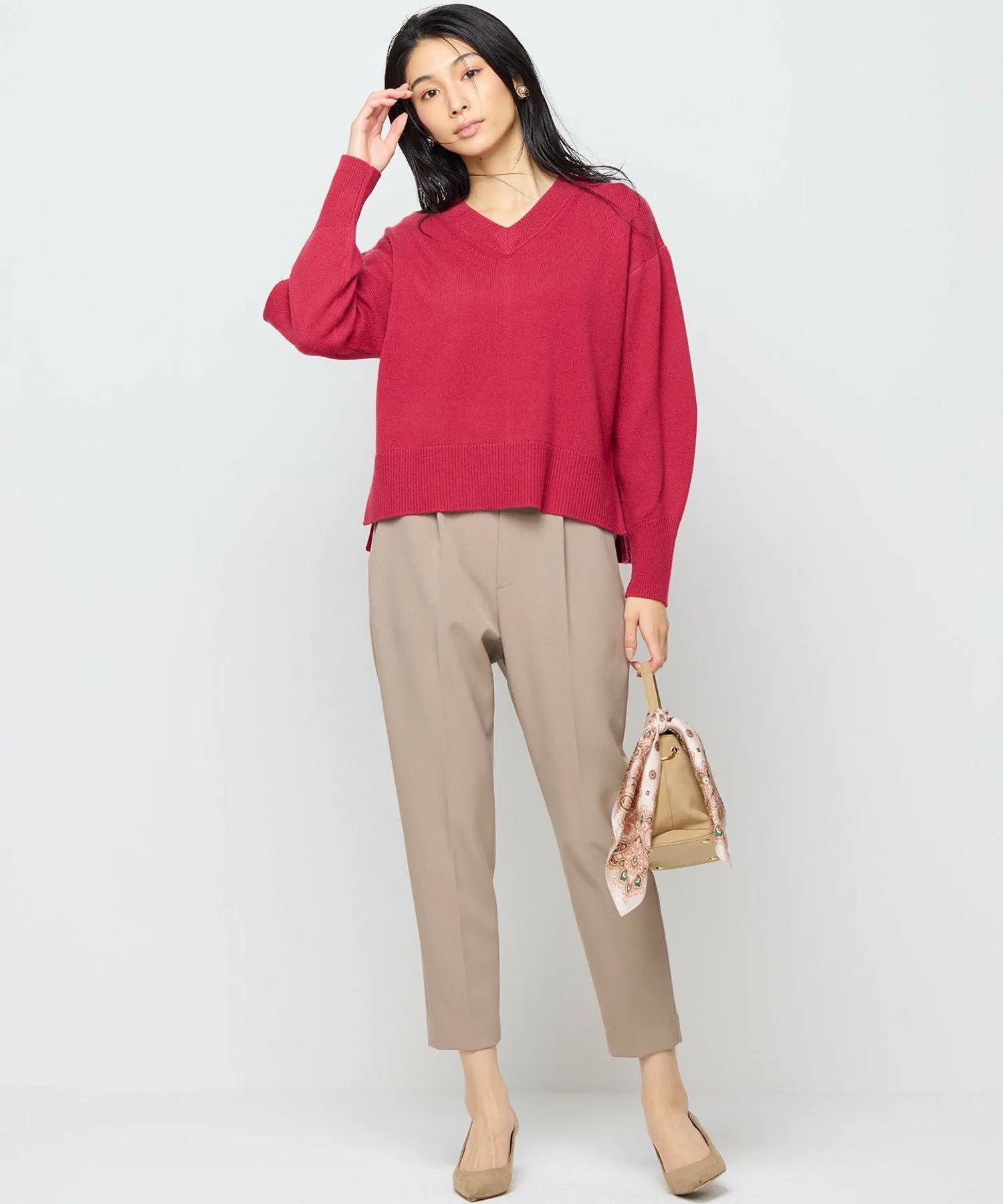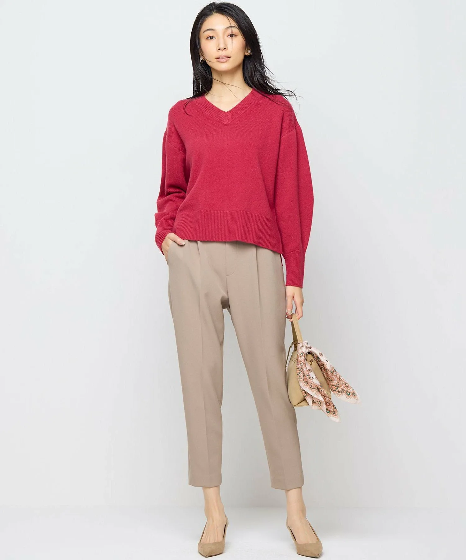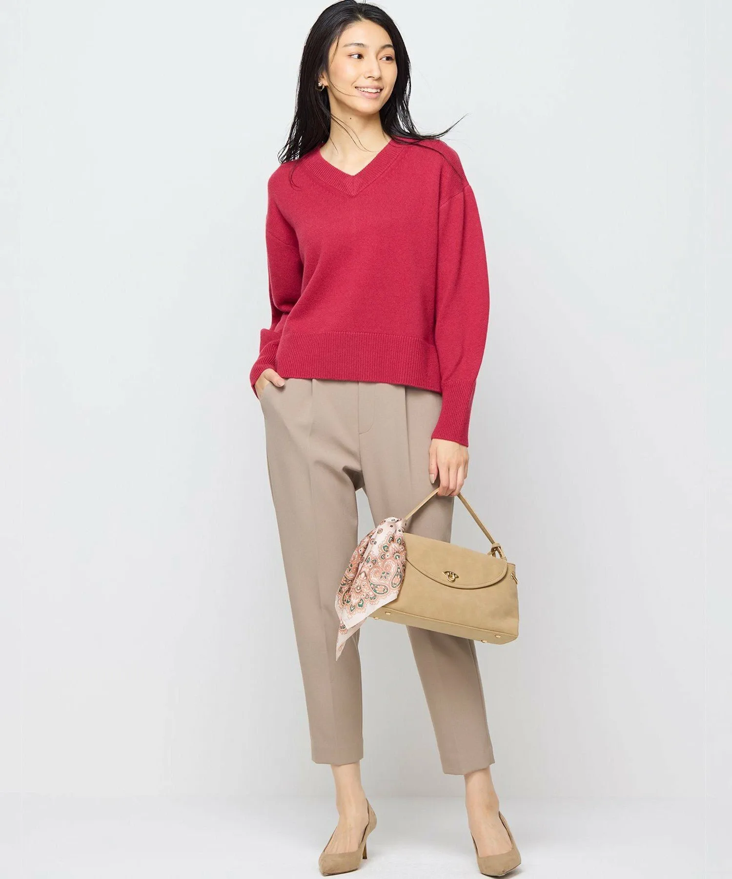 Серия «Шерсть-кашемир» \ Высококачественная смесь кашемира предлагает элегантные, красивые цвета. / Женственный V-образный вырез создает аккуратный, привлекательный образ. Дизайн: Этот женственный пуловер имеет неглубокий V-образный вырез спереди и сзади, создавая аккуратный, привлекательный образ. Рукава удобно сидят на некотором расстоянии от тела, а длинные манжеты с диагональной ребристой отделкой и глубокие боковые разрезы создают компактный, сбалансированный вид, придавая образу естественную изысканность. Задняя панель обеспечивает идеальный обзор спины, делая этот свитер простым, но эффектным. В зависимости от аксессуаров, которые вы с ним сочетаете, его можно носить как в повседневной жизни, так и на более торжественных мероприятиях. Материал: В этой смеси используется только лучший кашемир. Шерсть – это сверхтонкая шерсть, известная своей деликатной текстурой. Благодаря скручиванию двух типов пряжи достигается легкая, мягкая и пушистая текстура. Элегантные, яркие цвета, которые можно получить только с помощью высококачественной пряжи, также привлекательны.