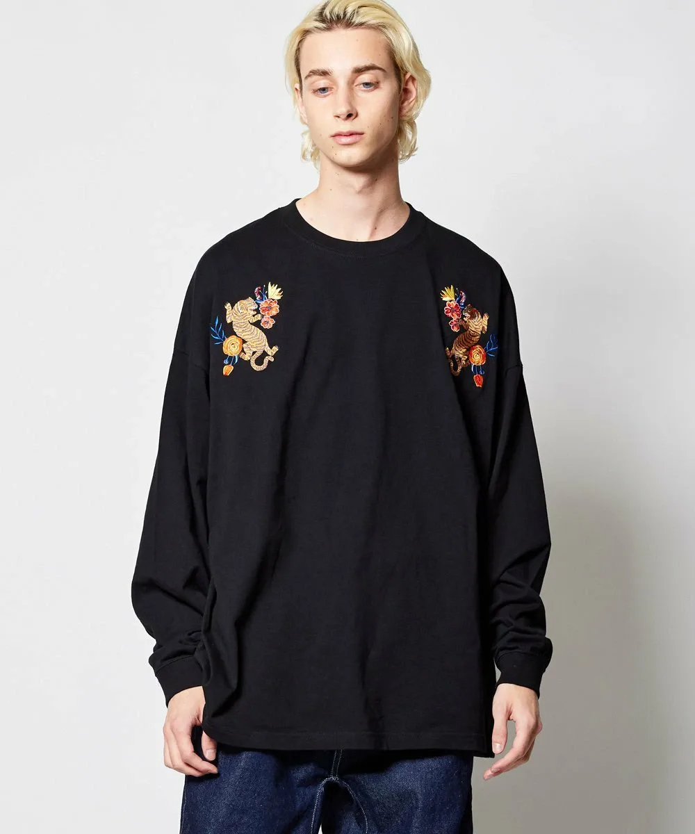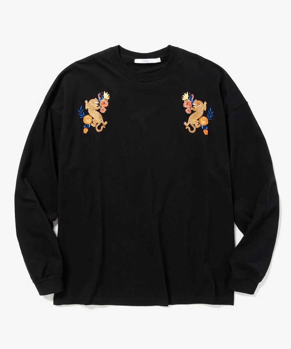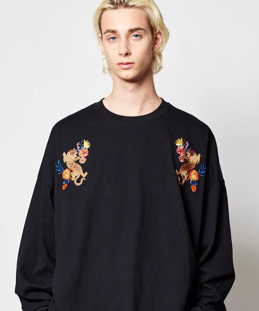 Этот топ с длинными рукавами украшен эффектной вышивкой в виде тигра с растительными мотивами на груди.