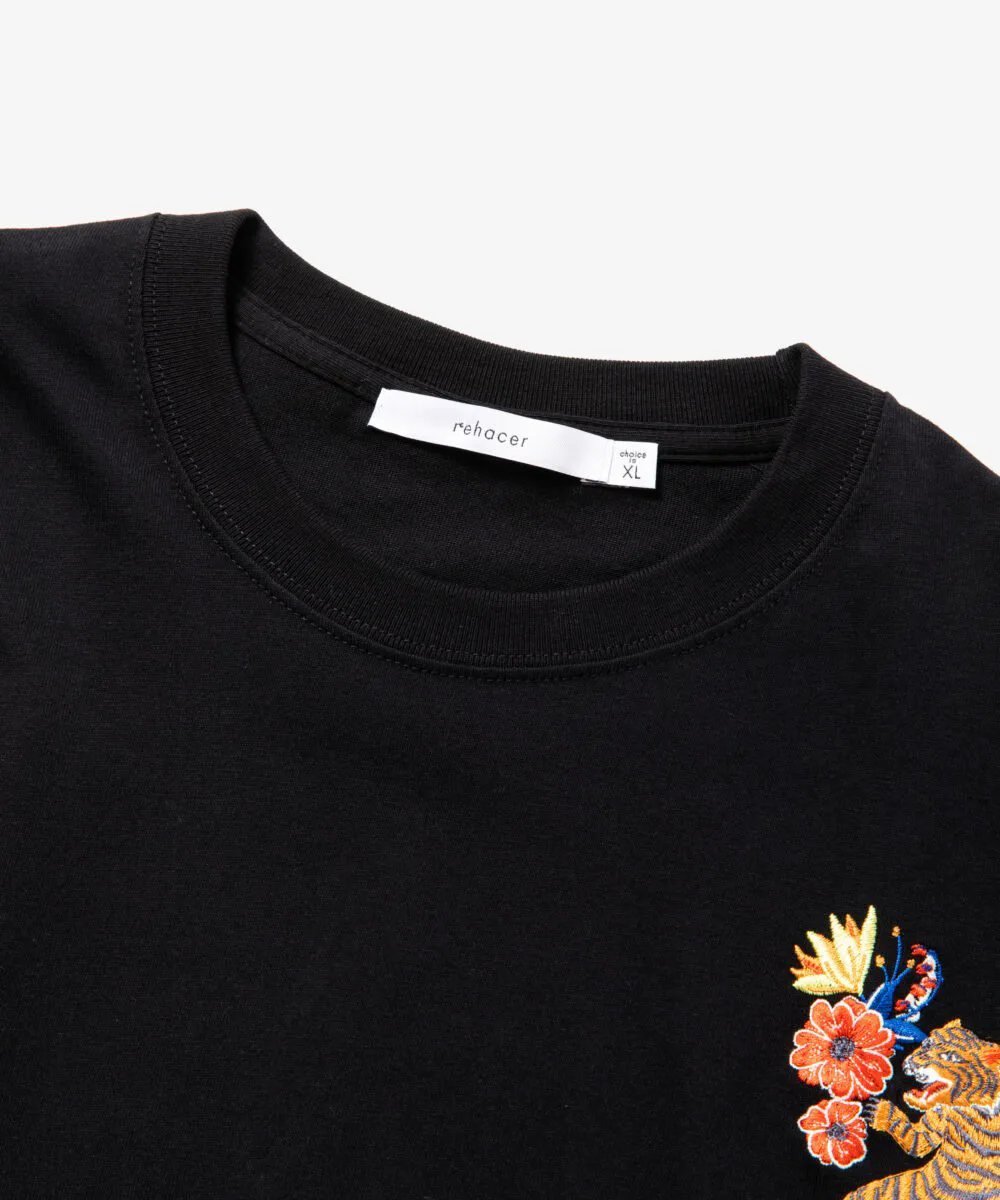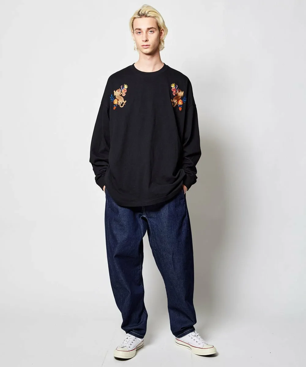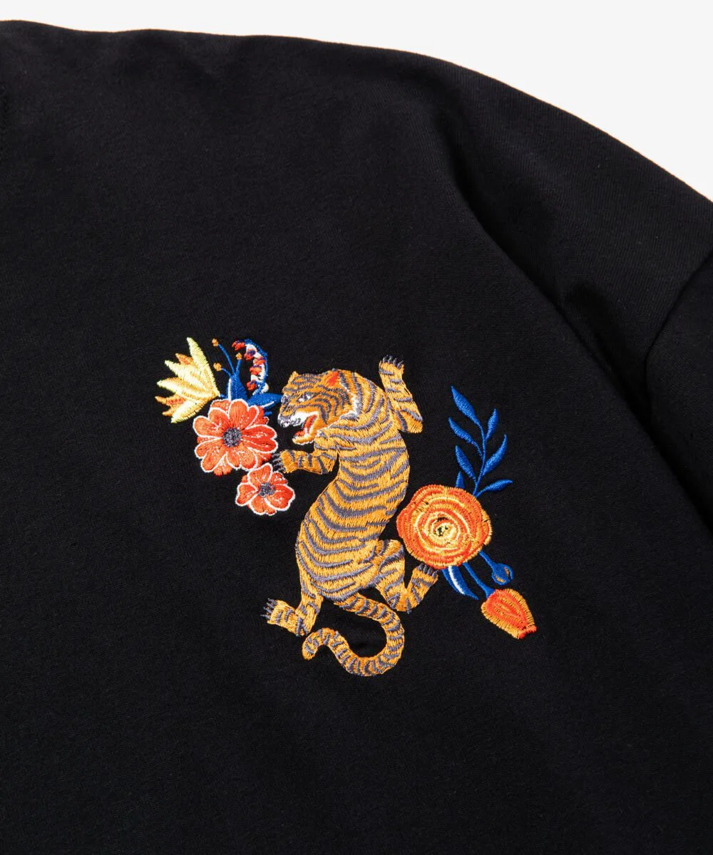 Этот топ с длинными рукавами украшен эффектной вышивкой в виде тигра с растительными мотивами на груди.