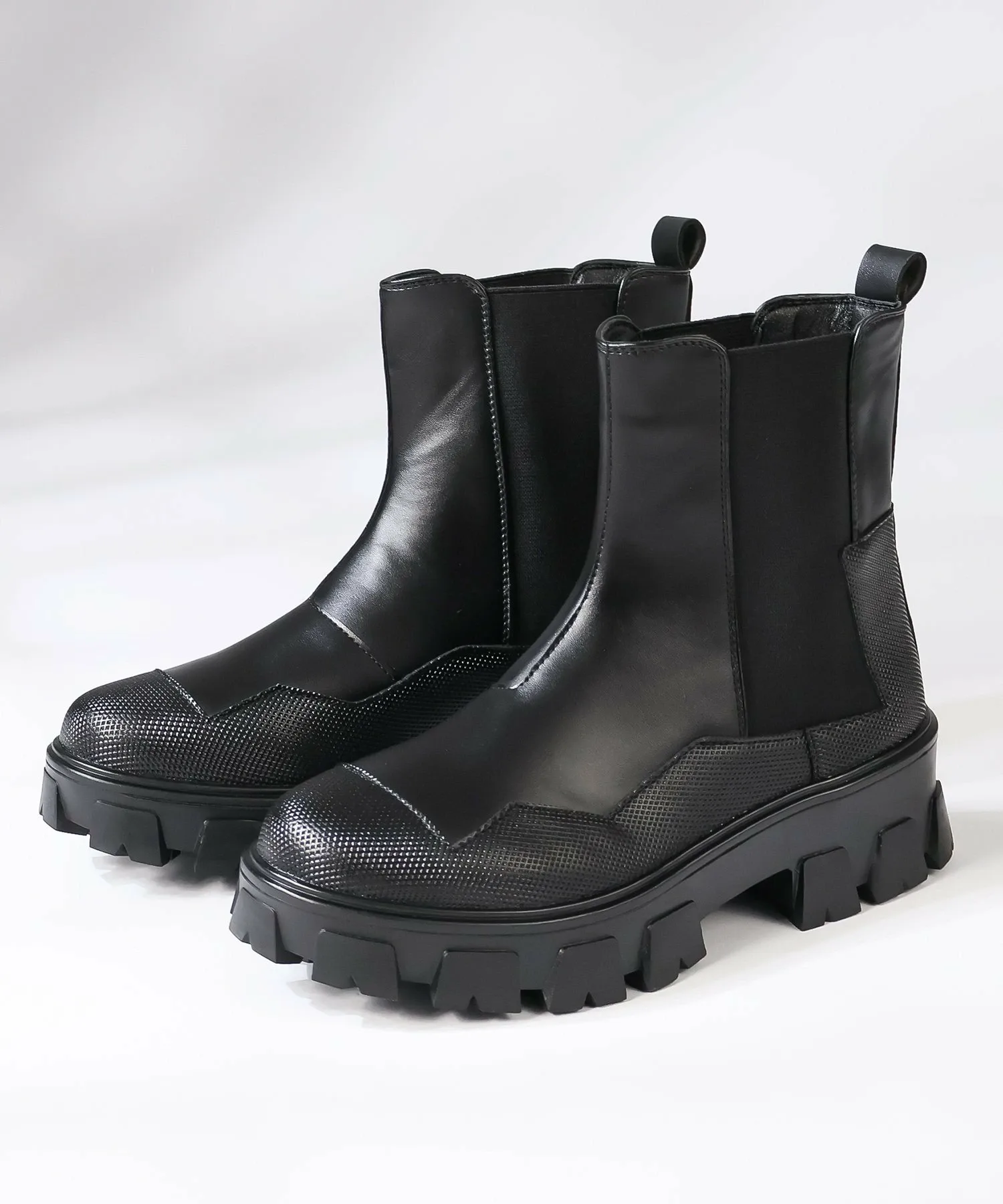 Эти ботинки на толстой подошве с боковыми вставками выполнены в едином черном дизайне для сдержанного образа.