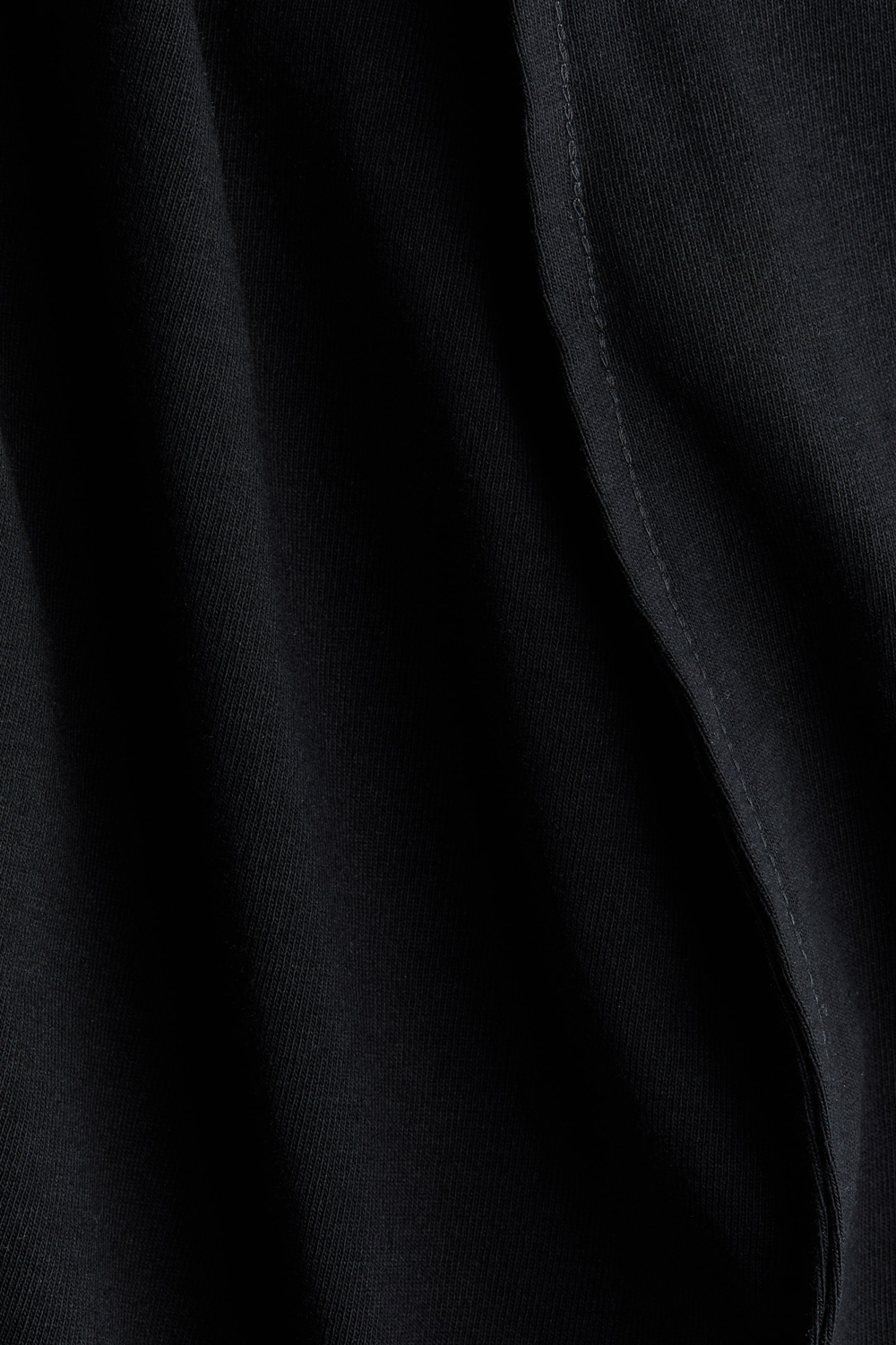 Эта футболка из лимитированной коллекции H&M Studio Collection переосмысливает понятие базовой вещи. Классический черный цвет и свободный крой — это лишь начало. Приглядитесь: архитектурные детали превращают простую футболку в объект современного искусства. Маленькая двухслойная кокетка сзади и смещенные вперед боковые швы добавляют объема и создают уникальный, продуманный силуэт, который выгодно отличается от всего, что вы видели раньше. Это не просто футболка — это заявление о стиле.