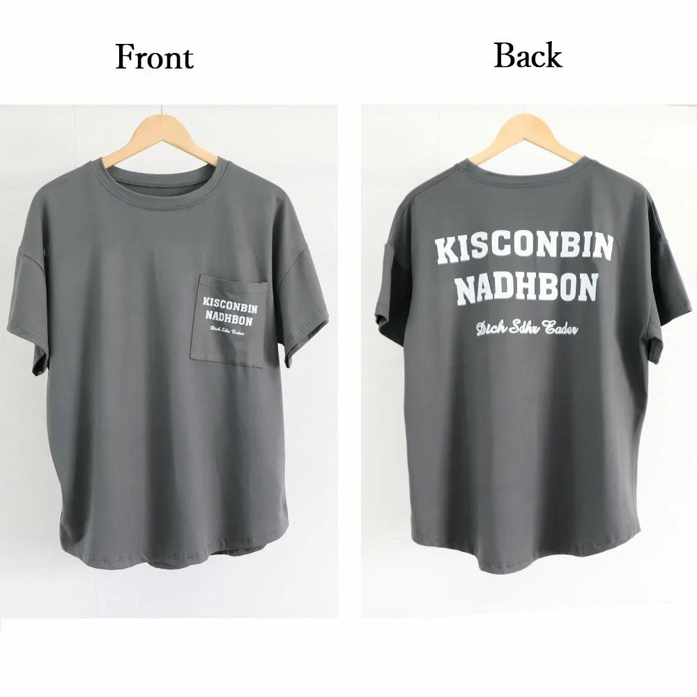 Простая футболка с круглым вырезом, с основным принтом на спине и дополнительным принтом на передней части.