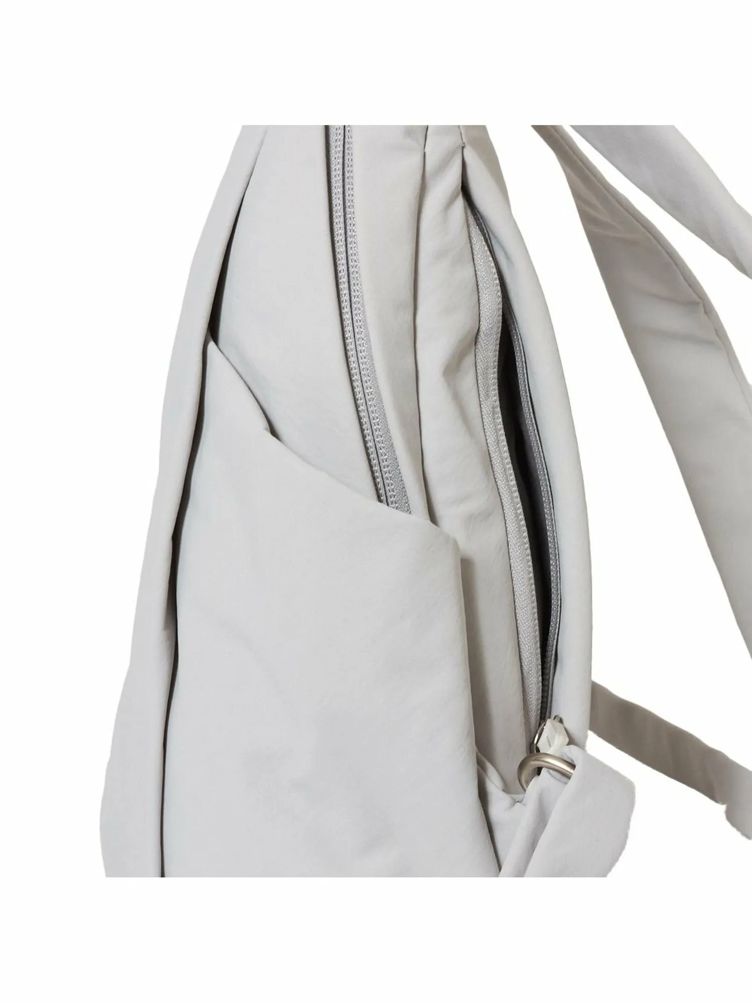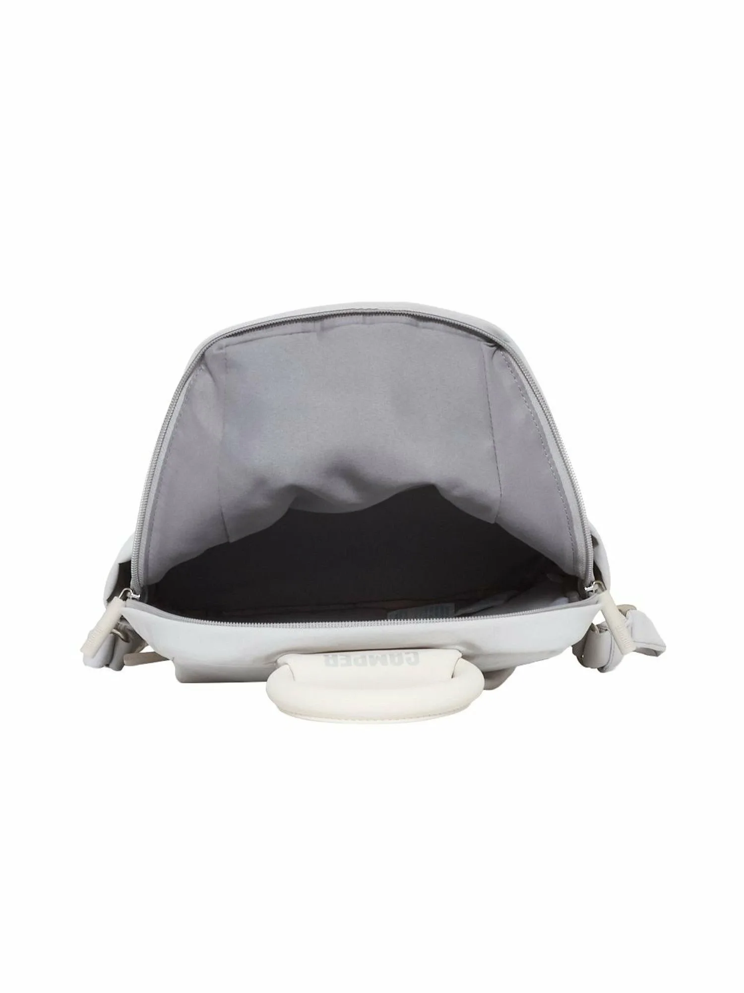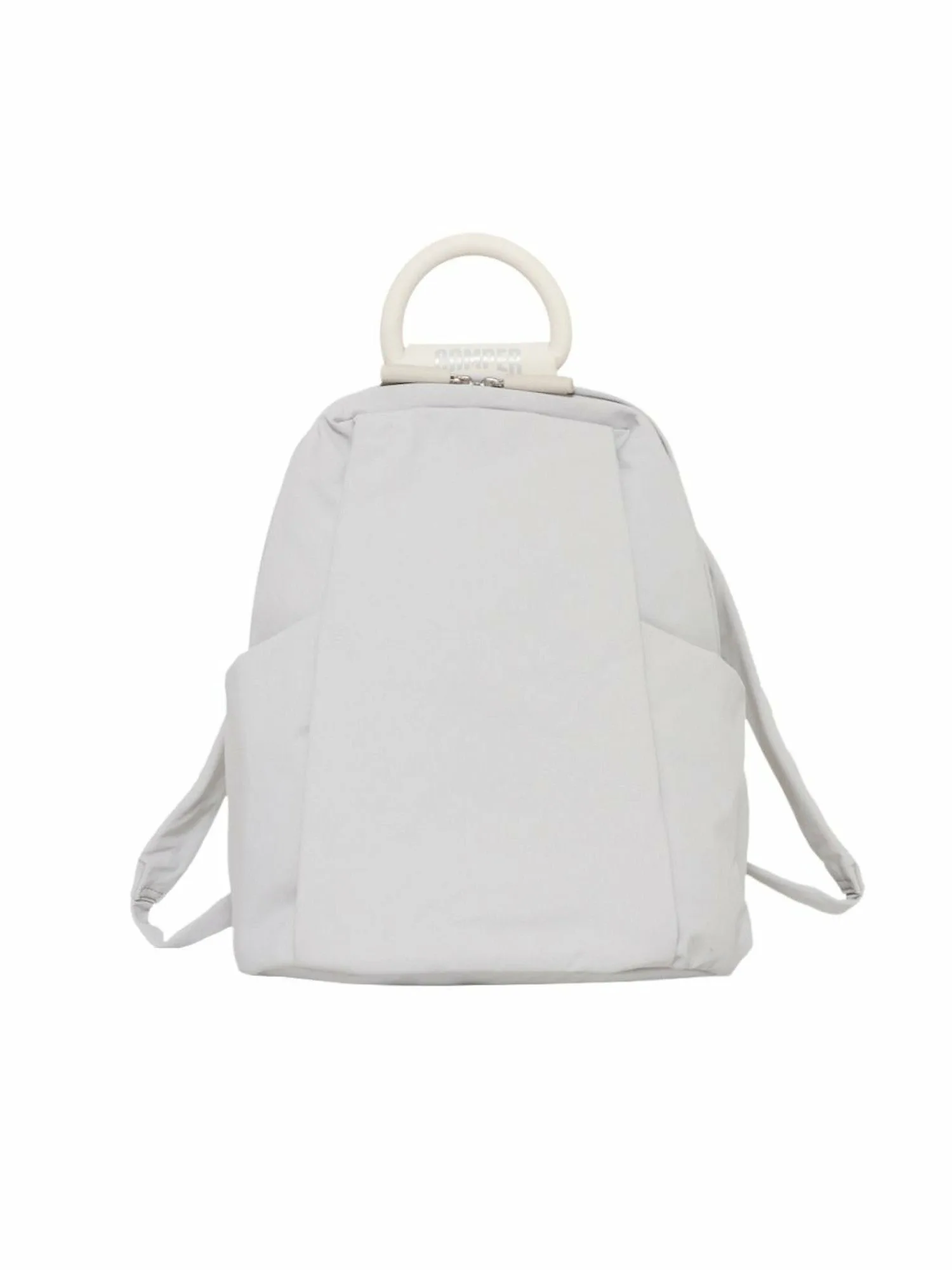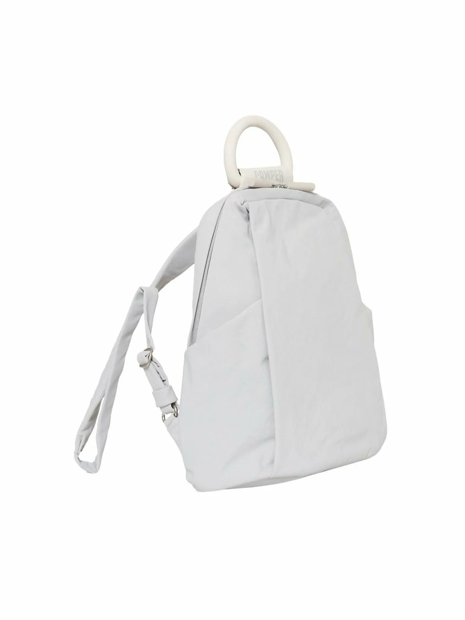 Дизайн рукоятки вдохновлен силуэтом плавательного круга, который можно увидеть на подошвах обуви из коллекции. Застежка-молния на основном отделении имеет характерную форму палочки, напоминающую трубку. Материал изготовлен из переработанной нейлоновой ткани с матовой поверхностью и легкой складкой, что снижает спортивный вид. Молния также спроектирована таким образом, чтобы быть максимально незаметной, что позволяет легко сочетать рюкзак с офисной одеждой. Карманы расположены с обеих сторон основного отделения и на спине, что делает этот рюкзак также функциональным.