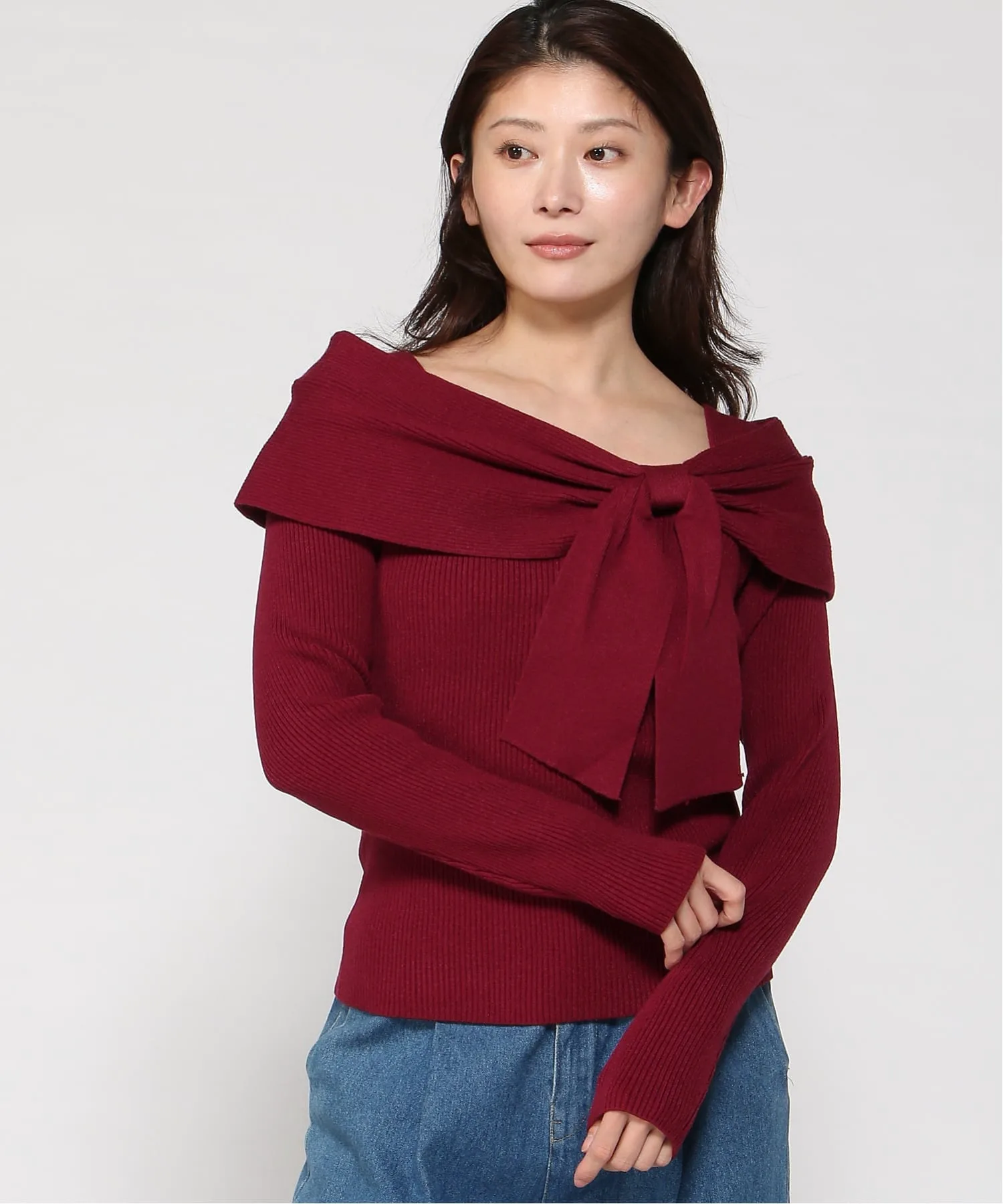 Представляем женственное трикотажное платье с открытыми плечами и большой лентой.