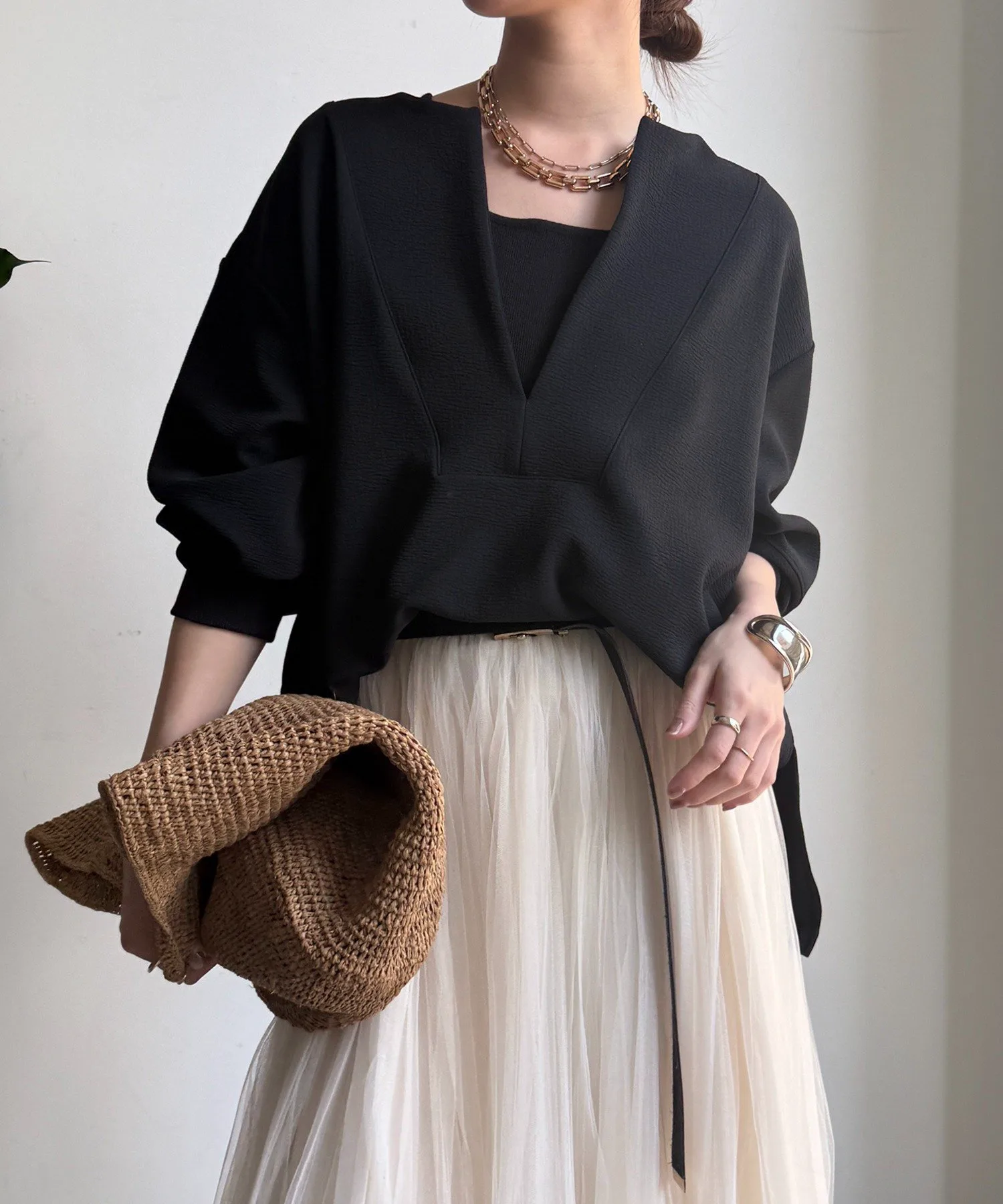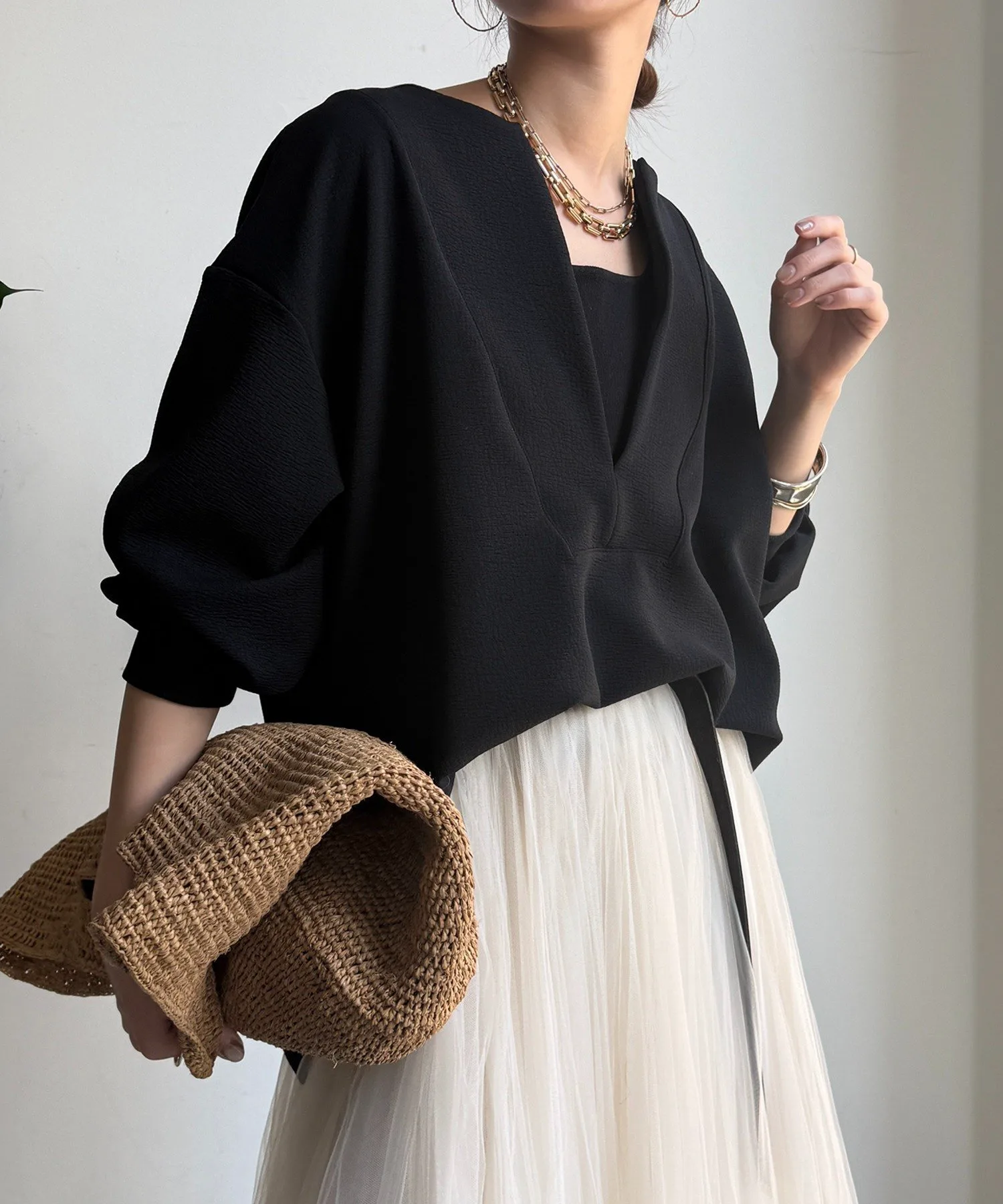 Не слишком глубокий V-образный вырез создает женственную мягкость.