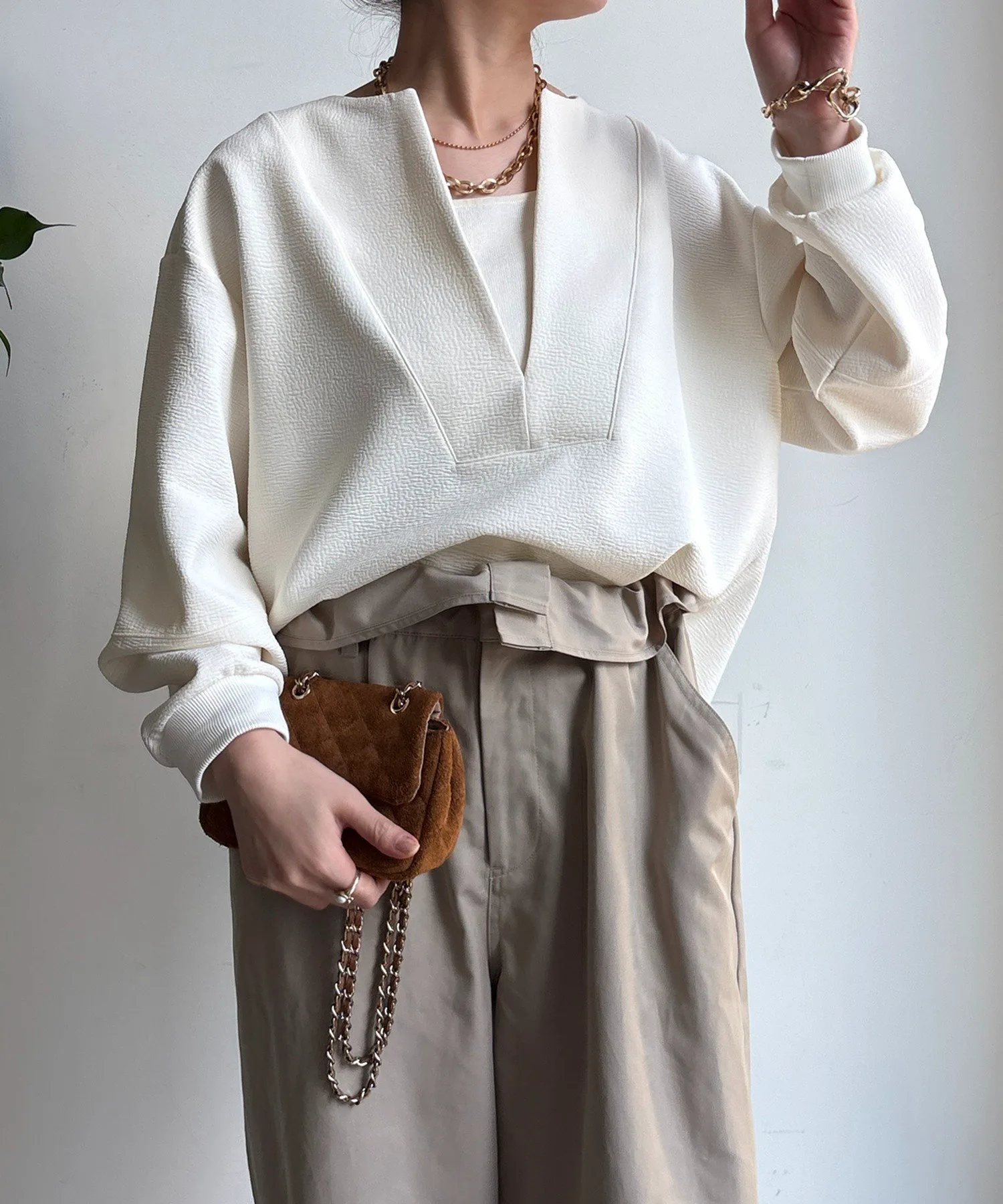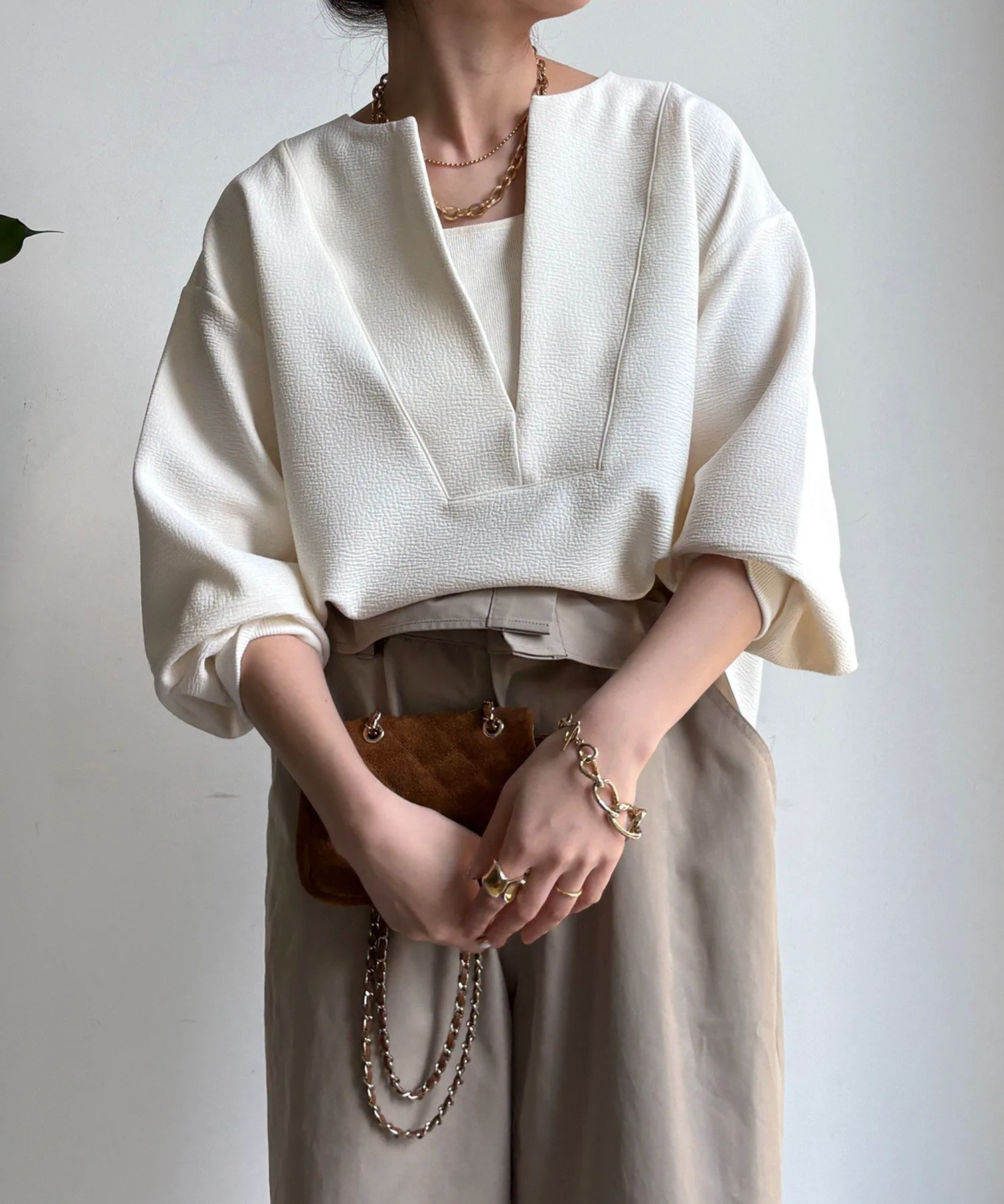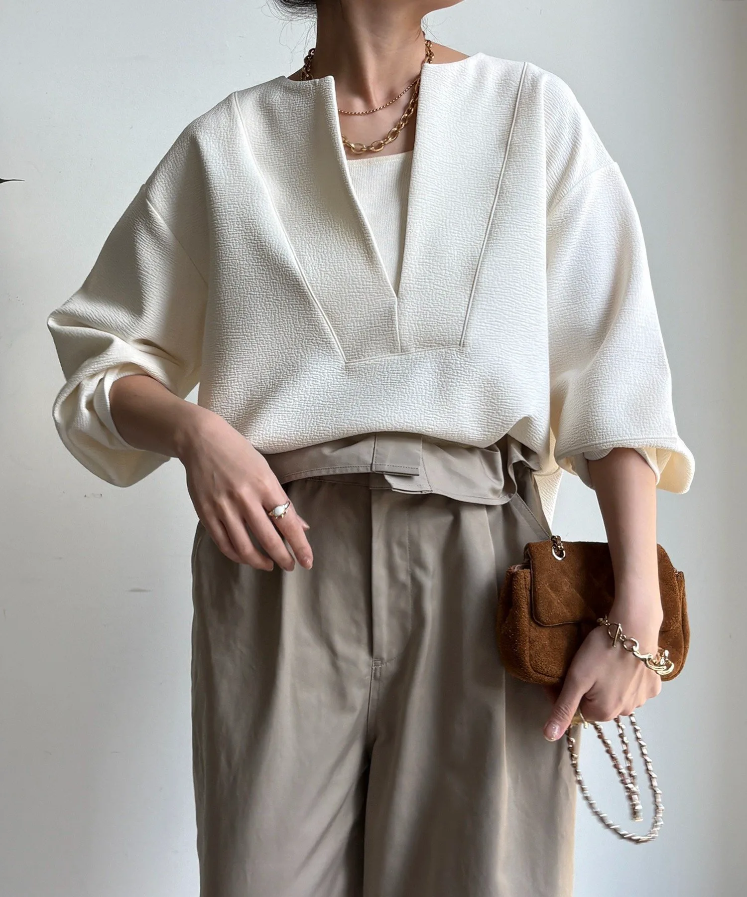 Не слишком глубокий V-образный вырез создает женственную мягкость.