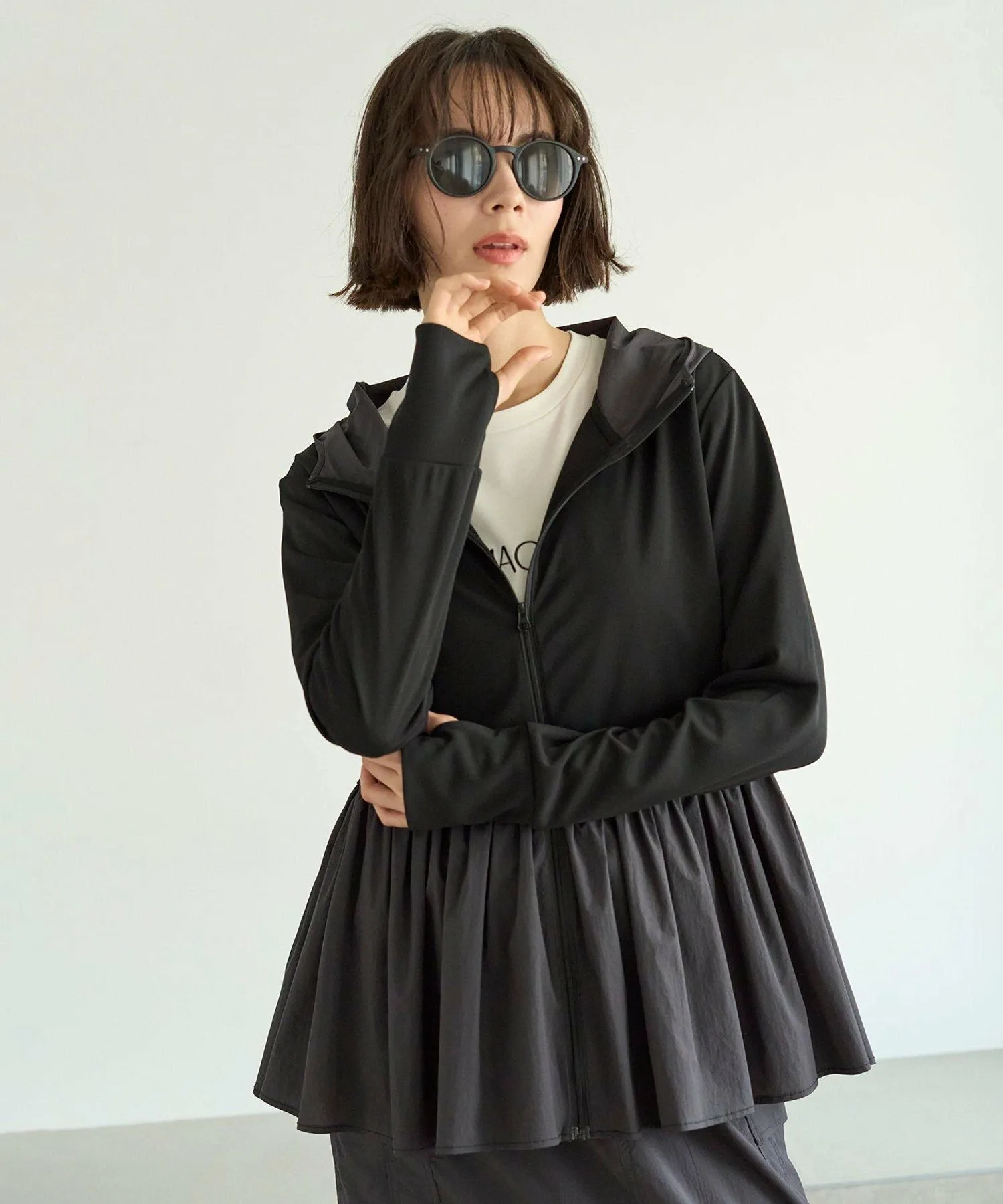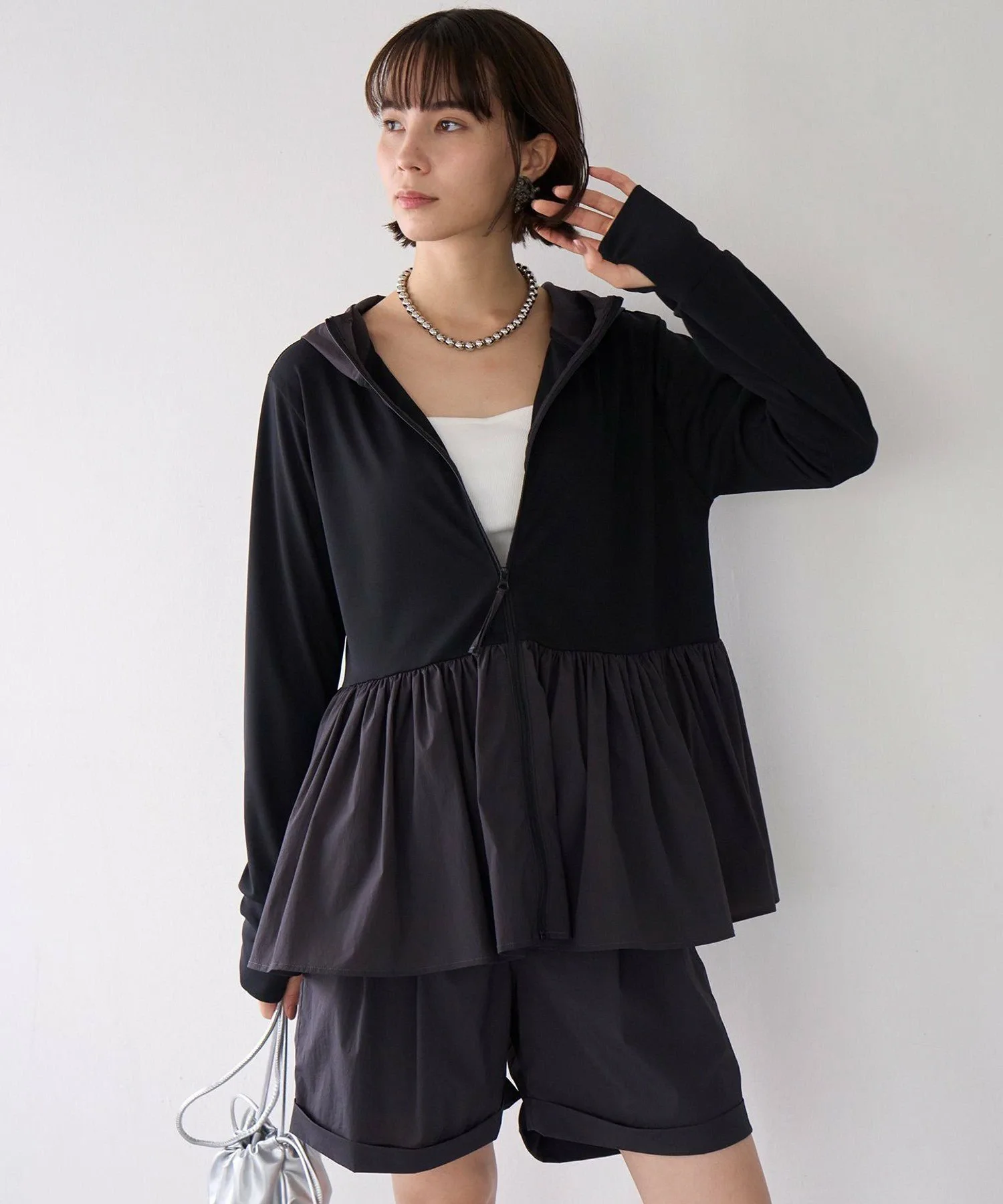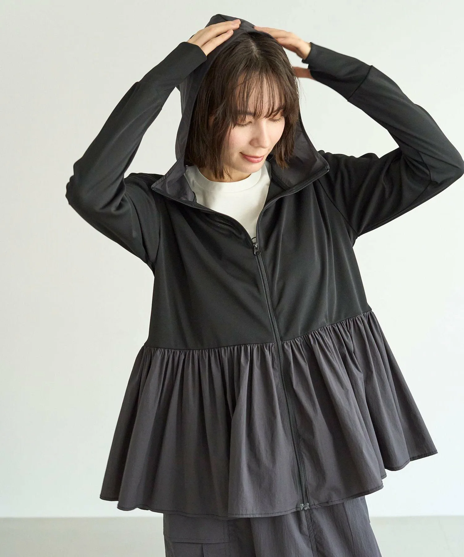 Дизайн: Этот рашгард на молнии, сшитый по индивидуальному заказу, идеально подходит для летних прогулок, где ультрафиолетовые лучи представляют опасность, а также для отдыха на воде. Длинные рукава закрывают тыльную сторону ладоней, а капюшон защищает шею от солнечных ожогов. Объемная баска также закрывает бедра, что делает его универсальным предметом одежды. Его также можно носить в комплекте с шортами из того же материала, что и баска. Цвет баски черного цвета (005) — угольно-серый. Песочный (043) и кремовый (001) цвета совпадают с цветом рашгарда.