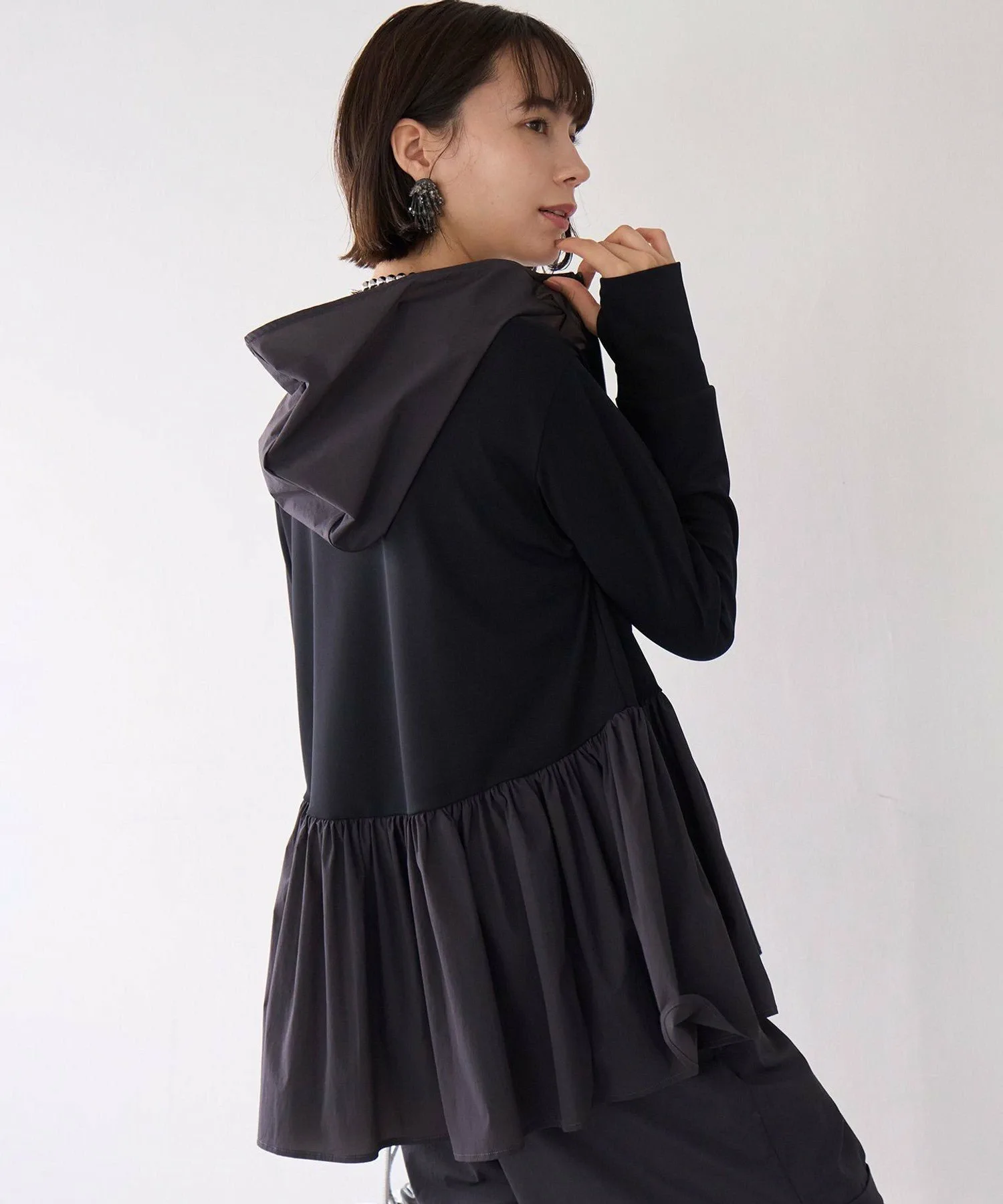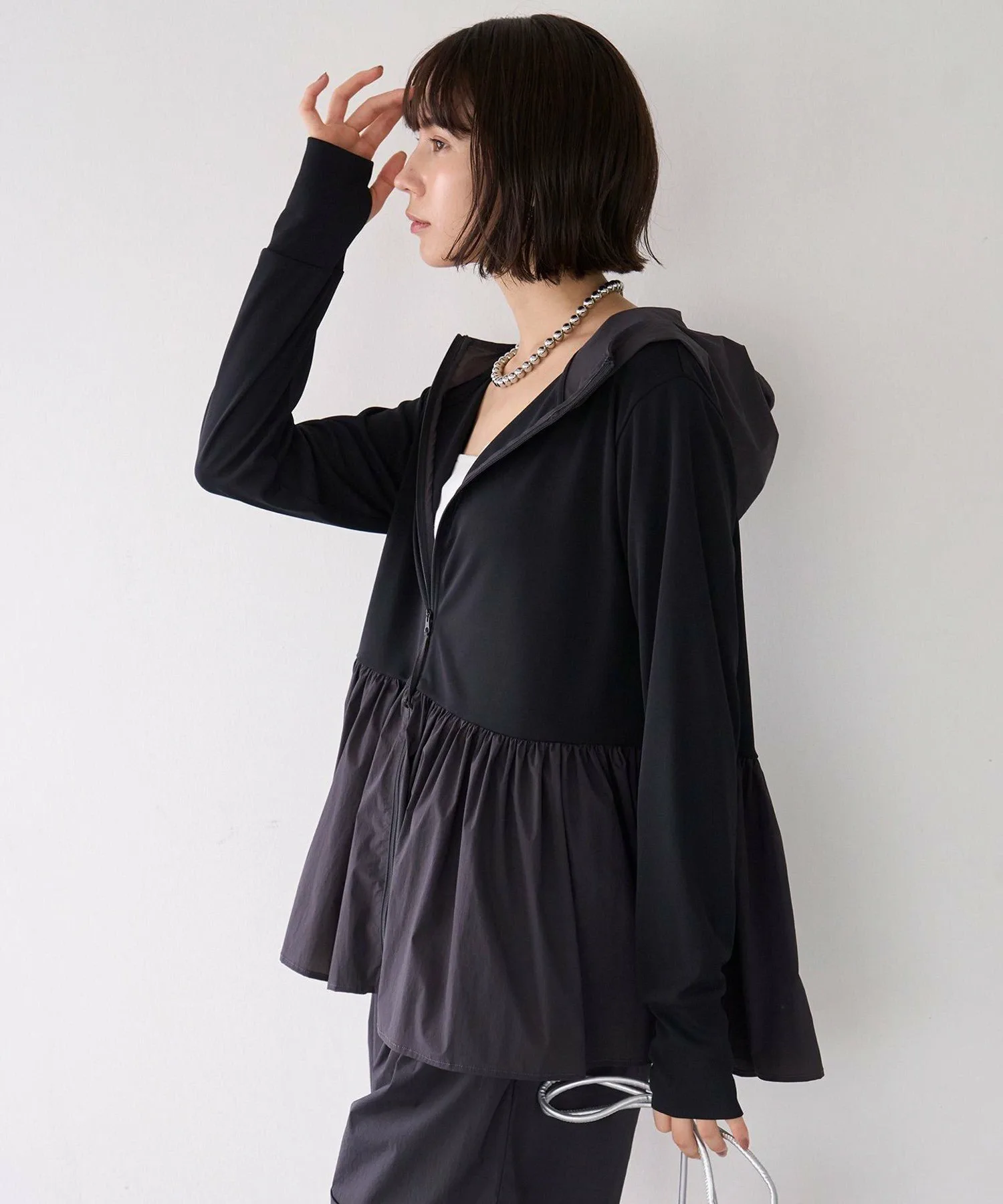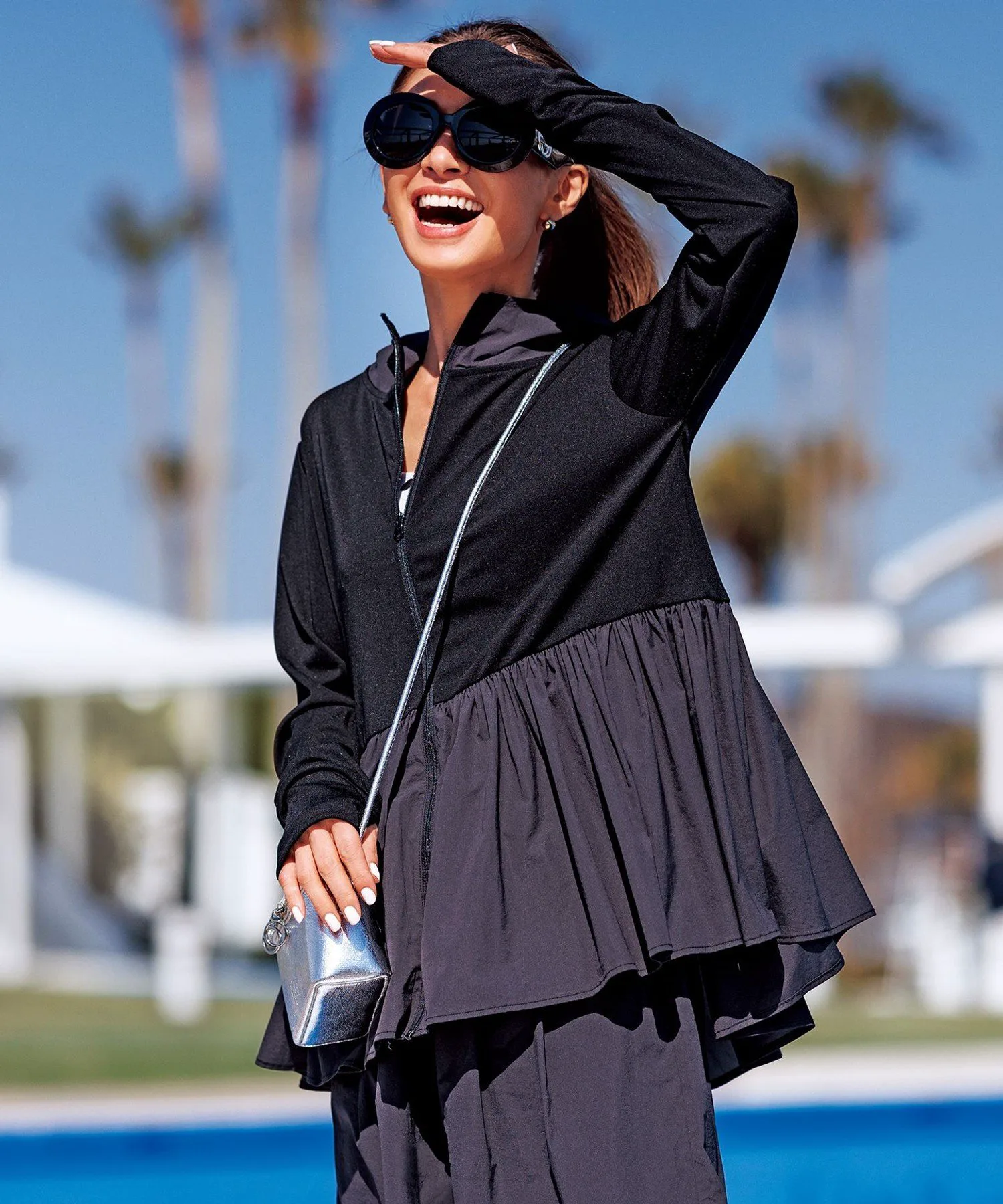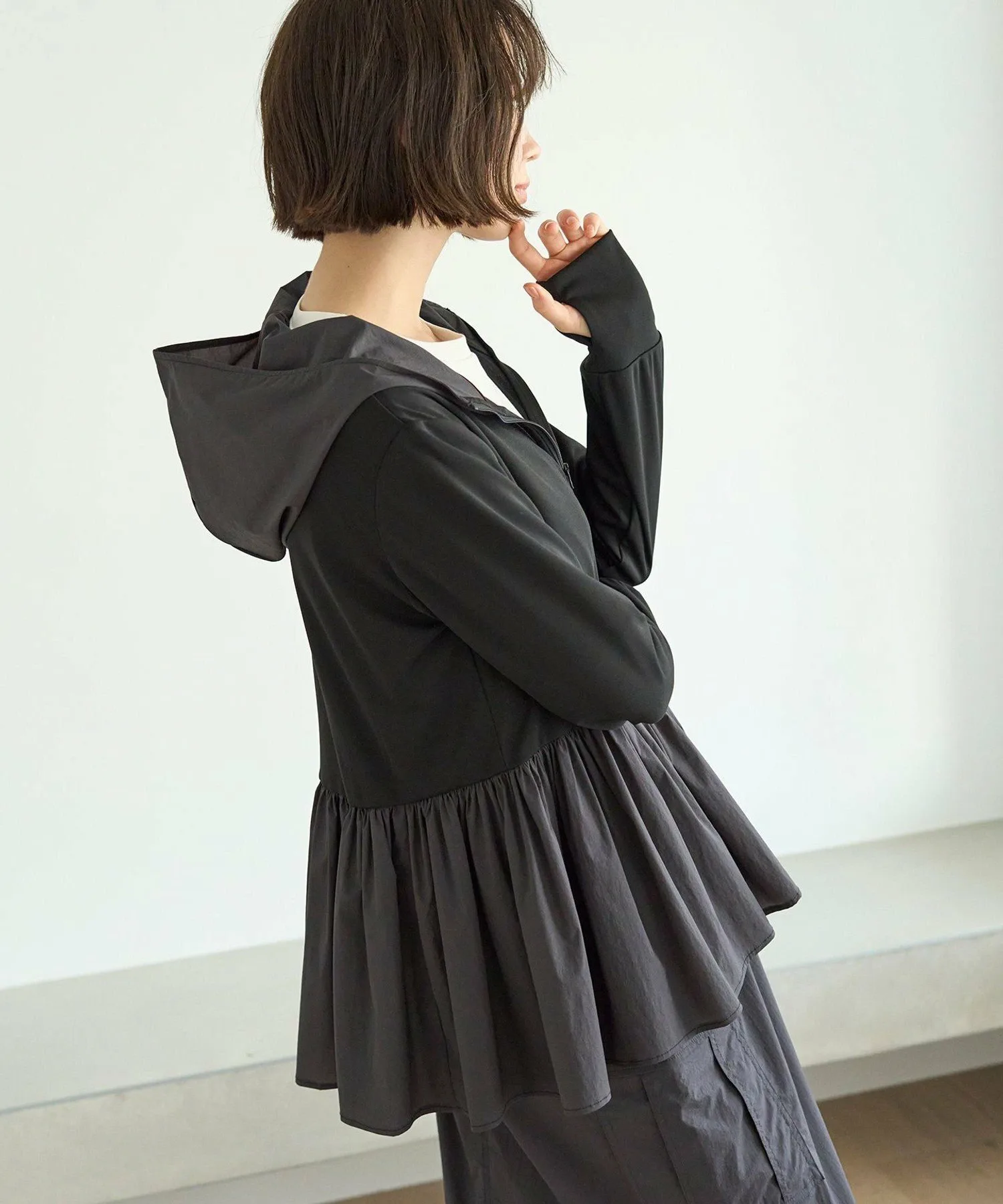 Дизайн: Этот рашгард на молнии, сшитый по индивидуальному заказу, идеально подходит для летних прогулок, где ультрафиолетовые лучи представляют опасность, а также для отдыха на воде. Длинные рукава закрывают тыльную сторону ладоней, а капюшон защищает шею от солнечных ожогов. Объемная баска также закрывает бедра, что делает его универсальным предметом одежды. Его также можно носить в комплекте с шортами из того же материала, что и баска. Цвет баски черного цвета (005) — угольно-серый. Песочный (043) и кремовый (001) цвета совпадают с цветом рашгарда.