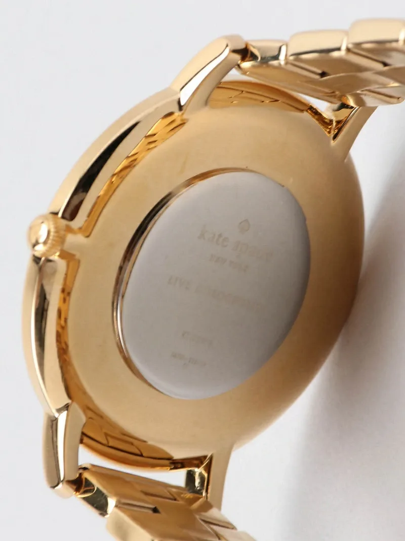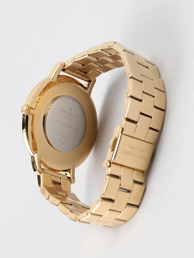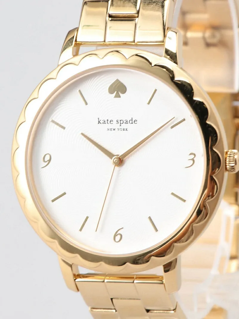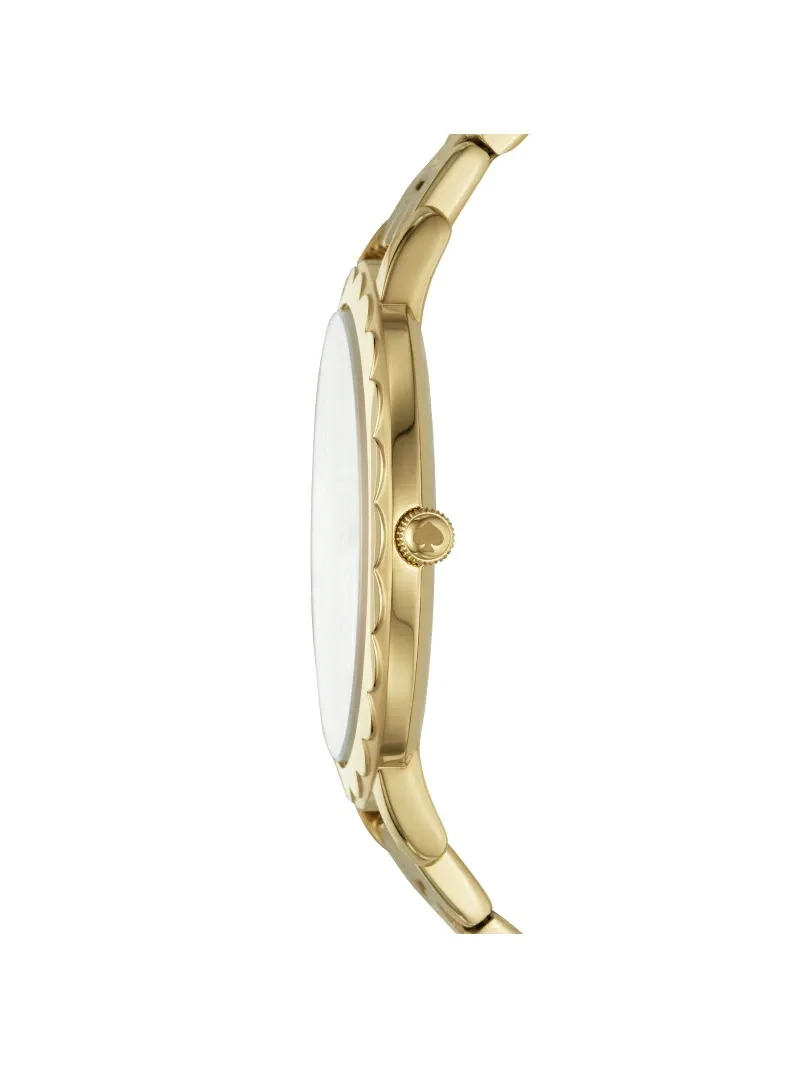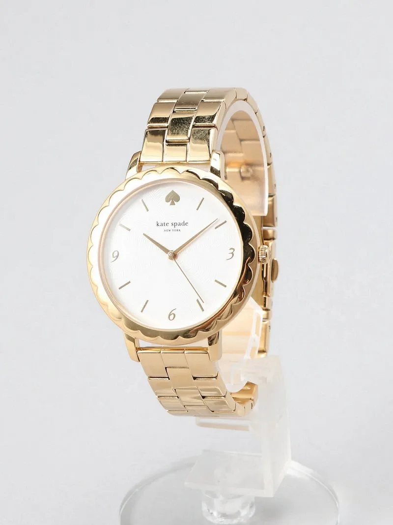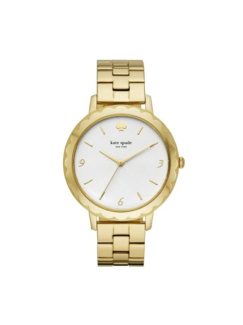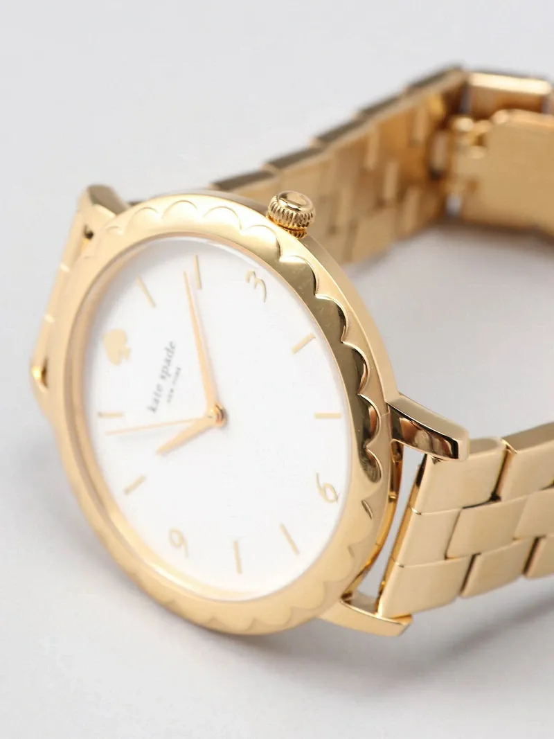 Эти часы METROSCALLOP оснащены трехстрелочным механизмом в 38-миллиметровом корпусе. Они имеют текстурированный белый циферблат с золотистыми индексами и цифрами, изящную оборку и золотистый браслет из нержавеющей стали.