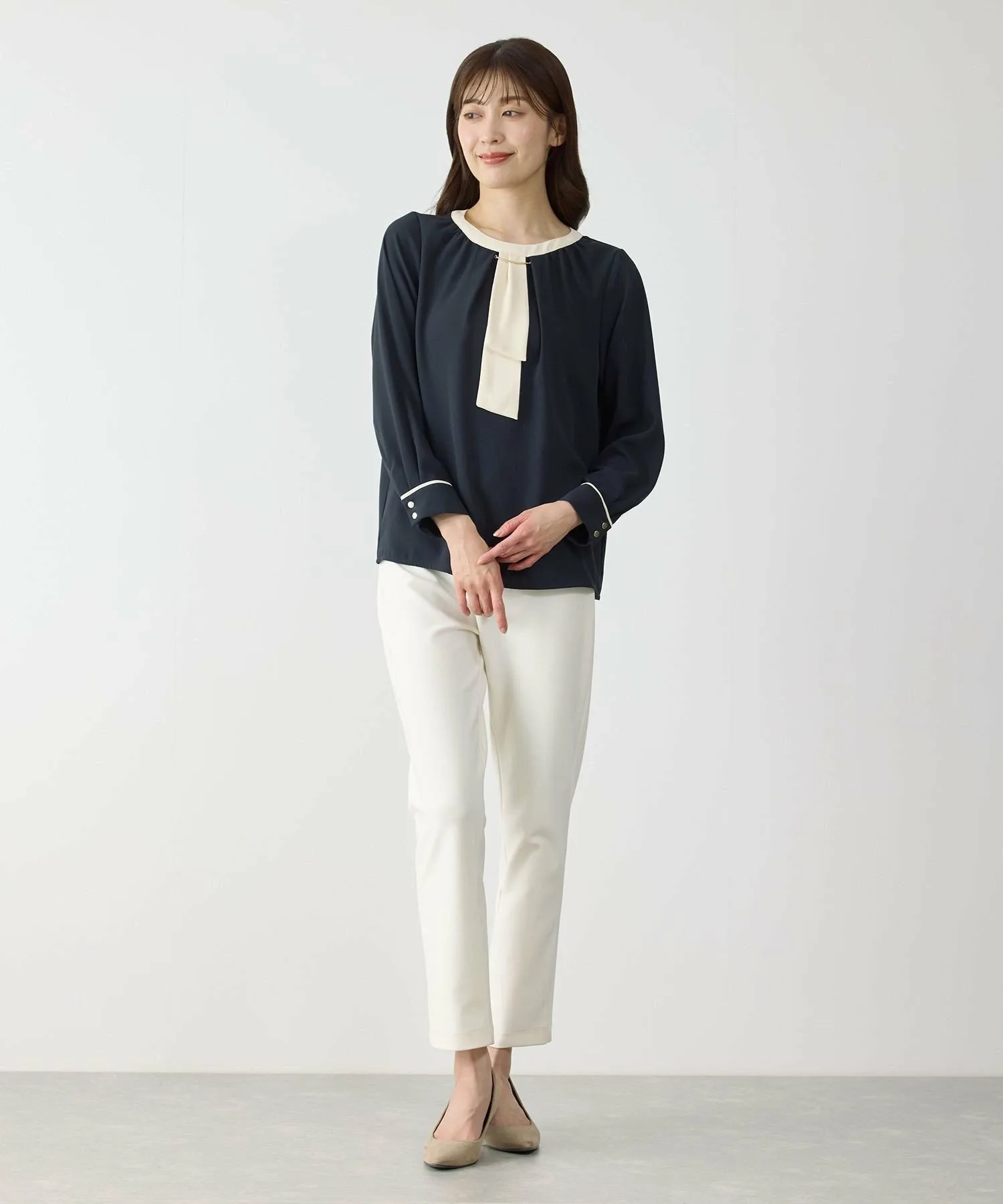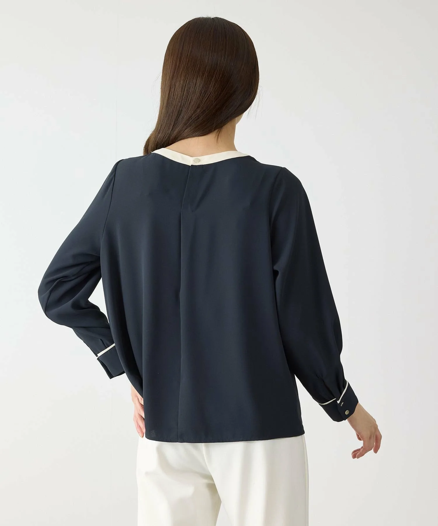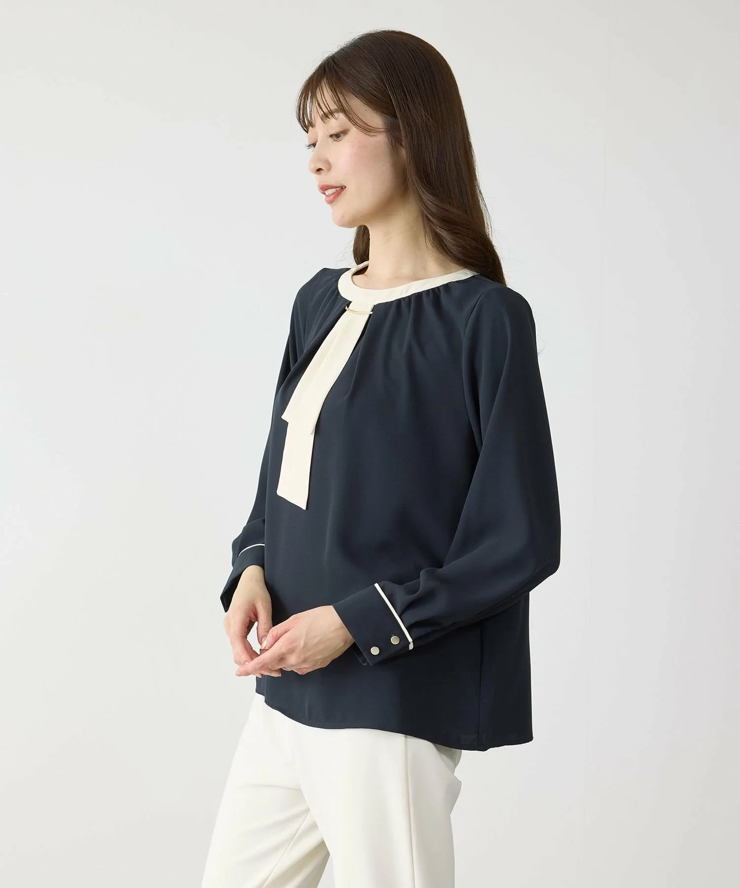 Излучая интеллект и элегантность. Двухцветная блузка, идеально подходящая для взрослых. [Дизайн/Силуэт]