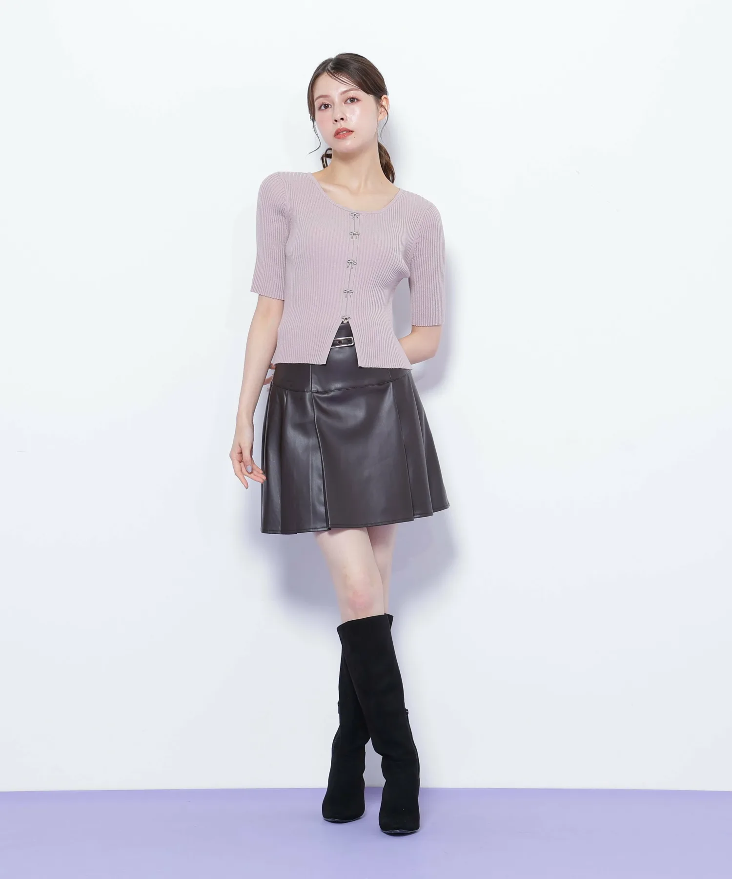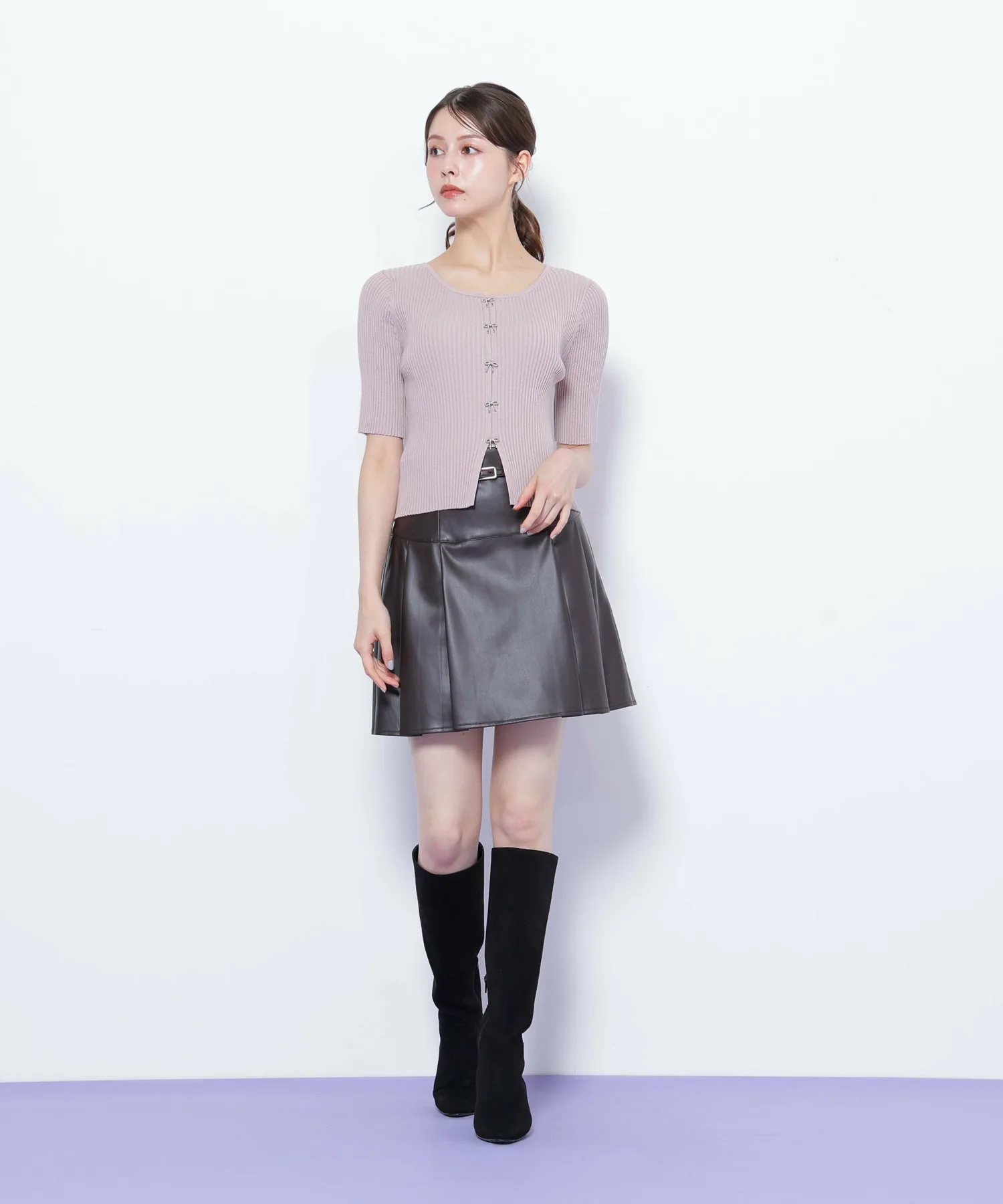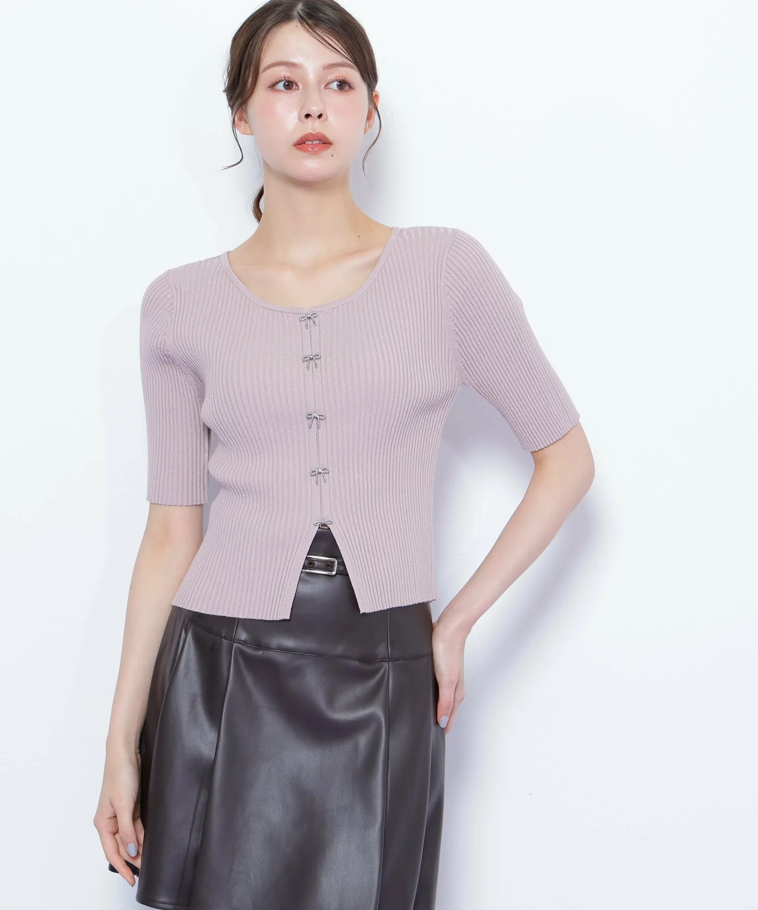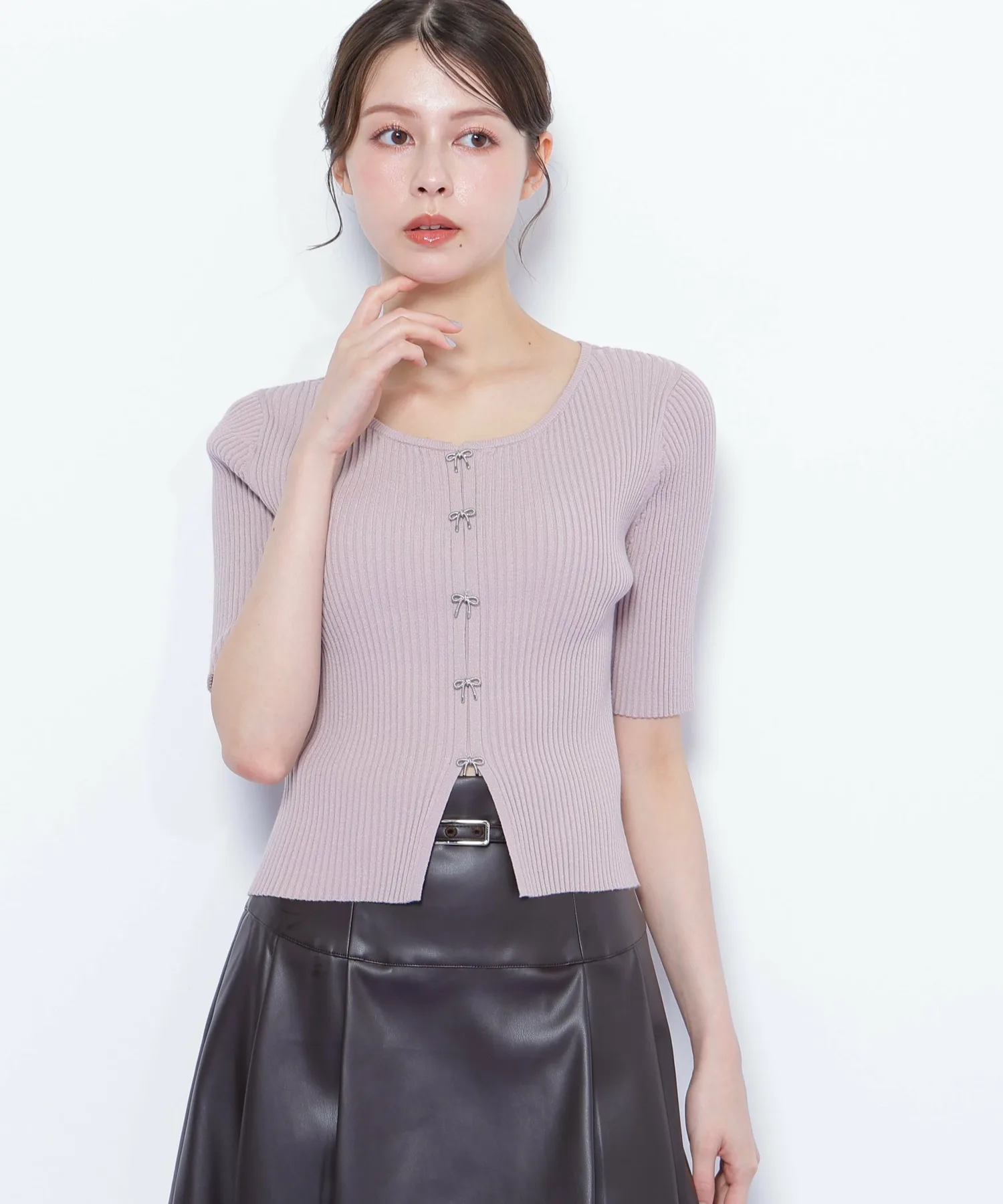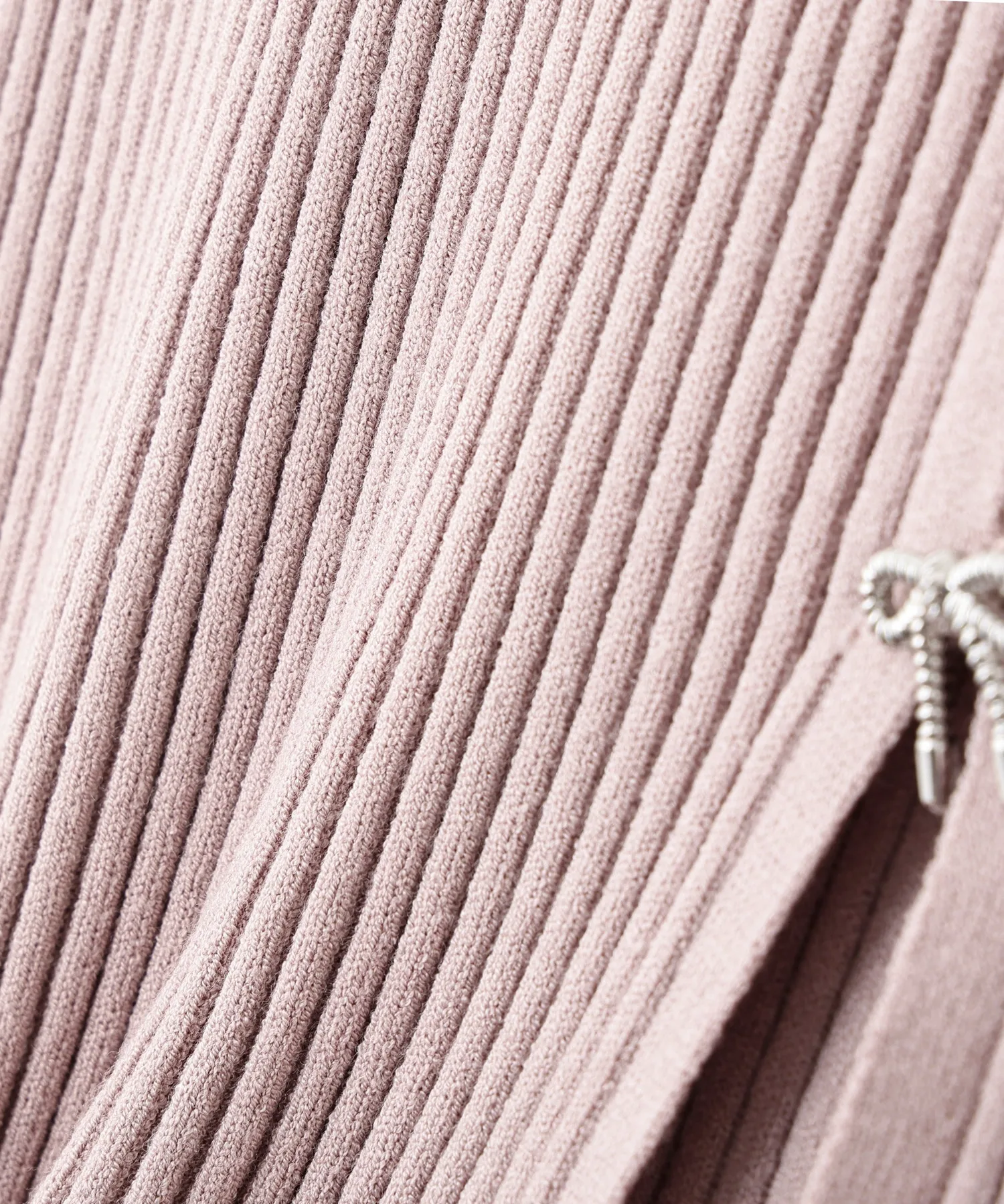 Трикотажное полотно в рубчик с пуговицами в виде лент, украшенными стразами. Простой силуэт дополнен изысканными деталями, которые визуально делают лицо ярче. Изготовлено из эластичного ребристого материала, хорошо сидит и удобно в носке. Разрез по низу спереди добавляет изюминку. Рекомендуется для создания женственного, но не слишком приторного образа. *Цвет может отличаться в зависимости от условий освещения во время фотосъемки.