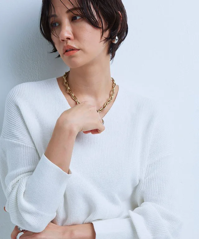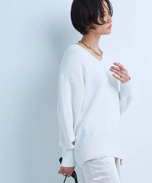 Свободный силуэт с округлой формой, облегающий тело. Умеренно открытый V-образный вырез прекрасно подчеркивает декольте, а естественный крой, спускающийся к спине, создает чистый, расслабленный дизайн. Ребристые манжеты создают плотный, четко очерченный силуэт.