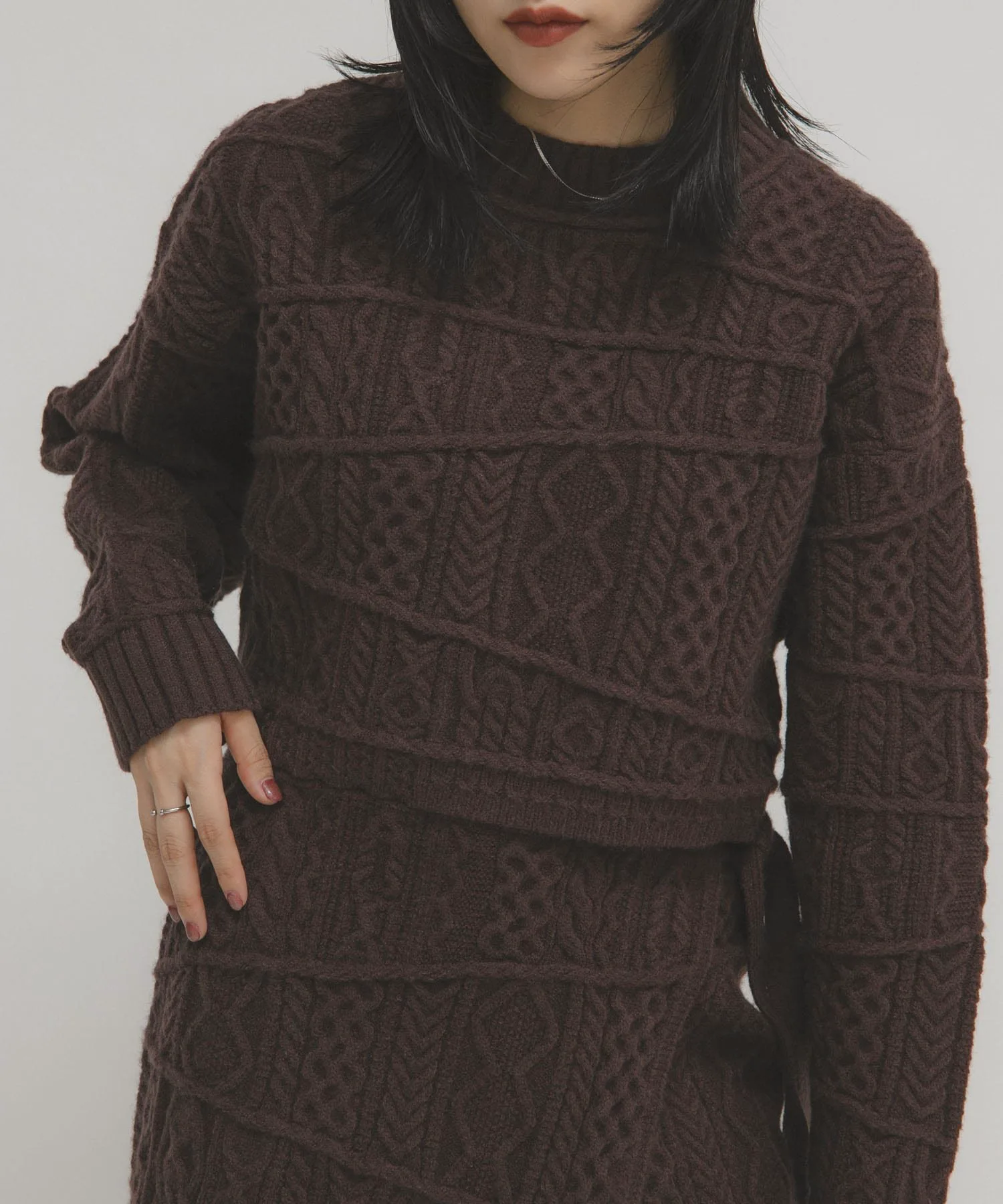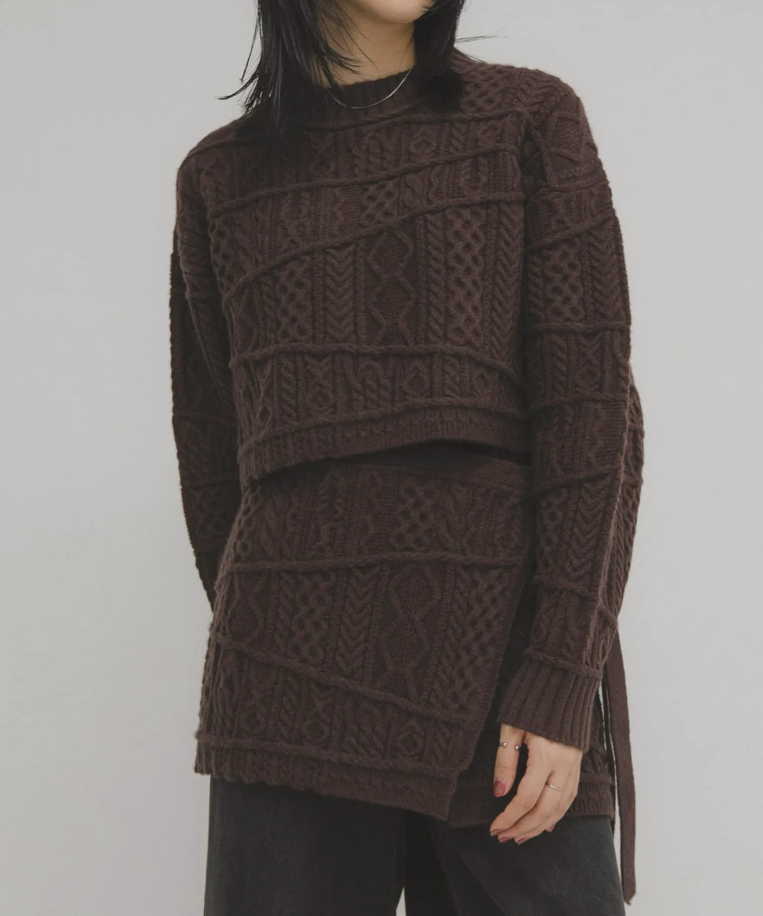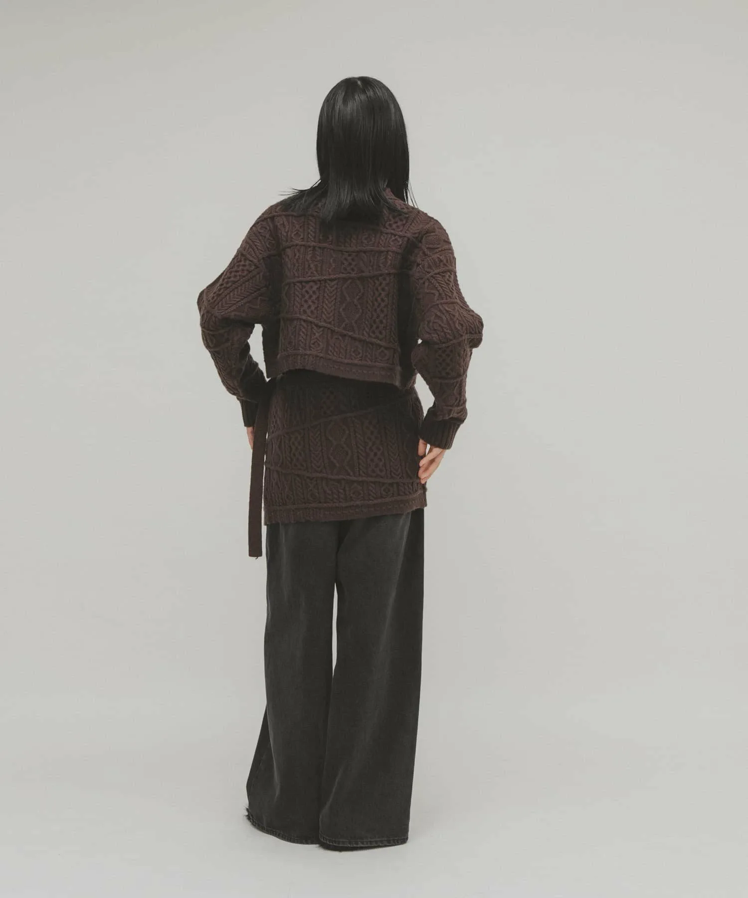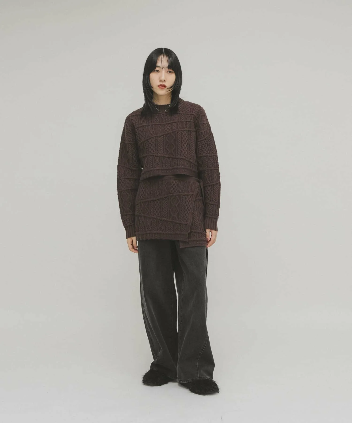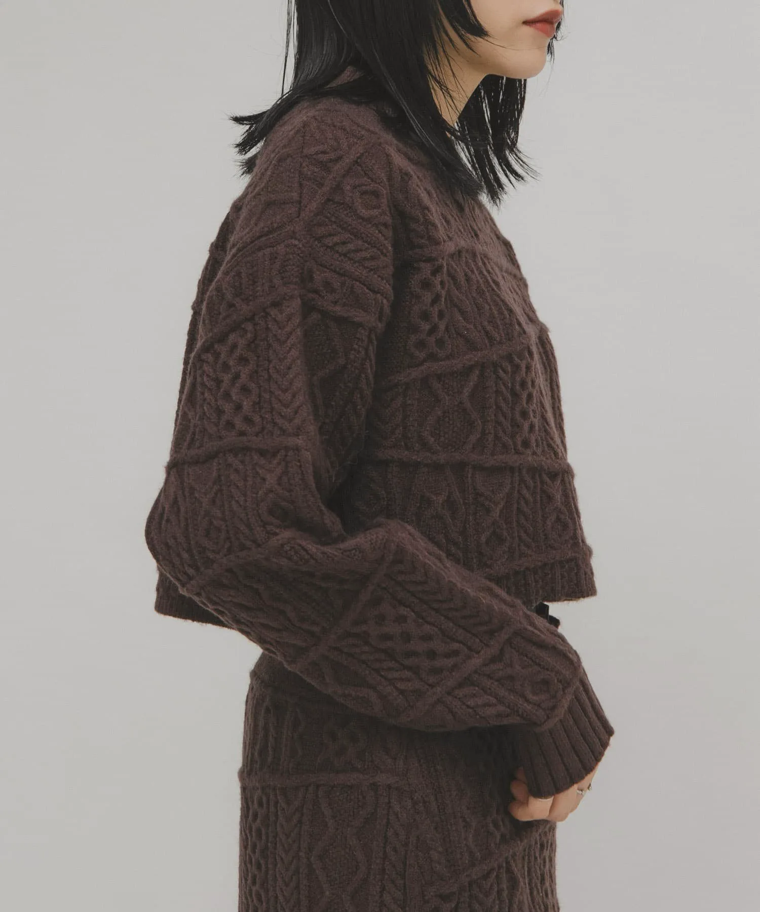 Запоминающийся и эффектный трикотаж с узором «косичка» в стиле пэчворк. Слегка плотная вязка придает изделию ощущение тяжести и формы. Укороченная длина позволяет легко создать баланс. Мы также рекомендуем сочетать его с юбкой-оберткой MIX Cable Wrap Skirt (KBA7-25R120), изготовленной из того же материала.
