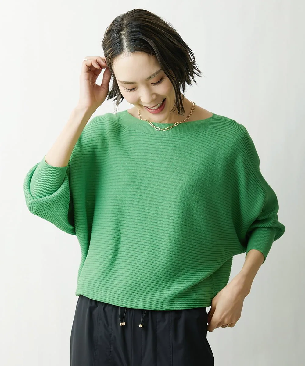 Пуловер с вырезом-лодочкой и рукавами «летучая мышь» с горизонтальной ребристой отделкой. Ребристая отделка манжет и низа создает привлекательный силуэт. Доступен в новых цветах весной 2023 года.