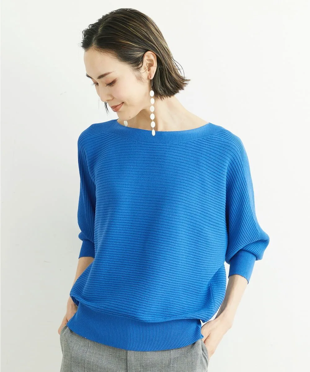Пуловер с вырезом-лодочкой и рукавами «летучая мышь» с горизонтальной ребристой отделкой. Ребристая отделка манжет и низа создает привлекательный силуэт. Доступен в новых цветах весной 2023 года.