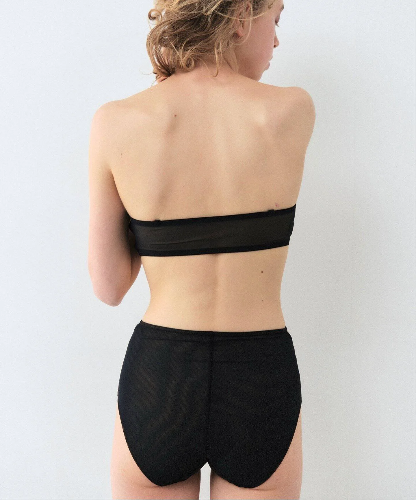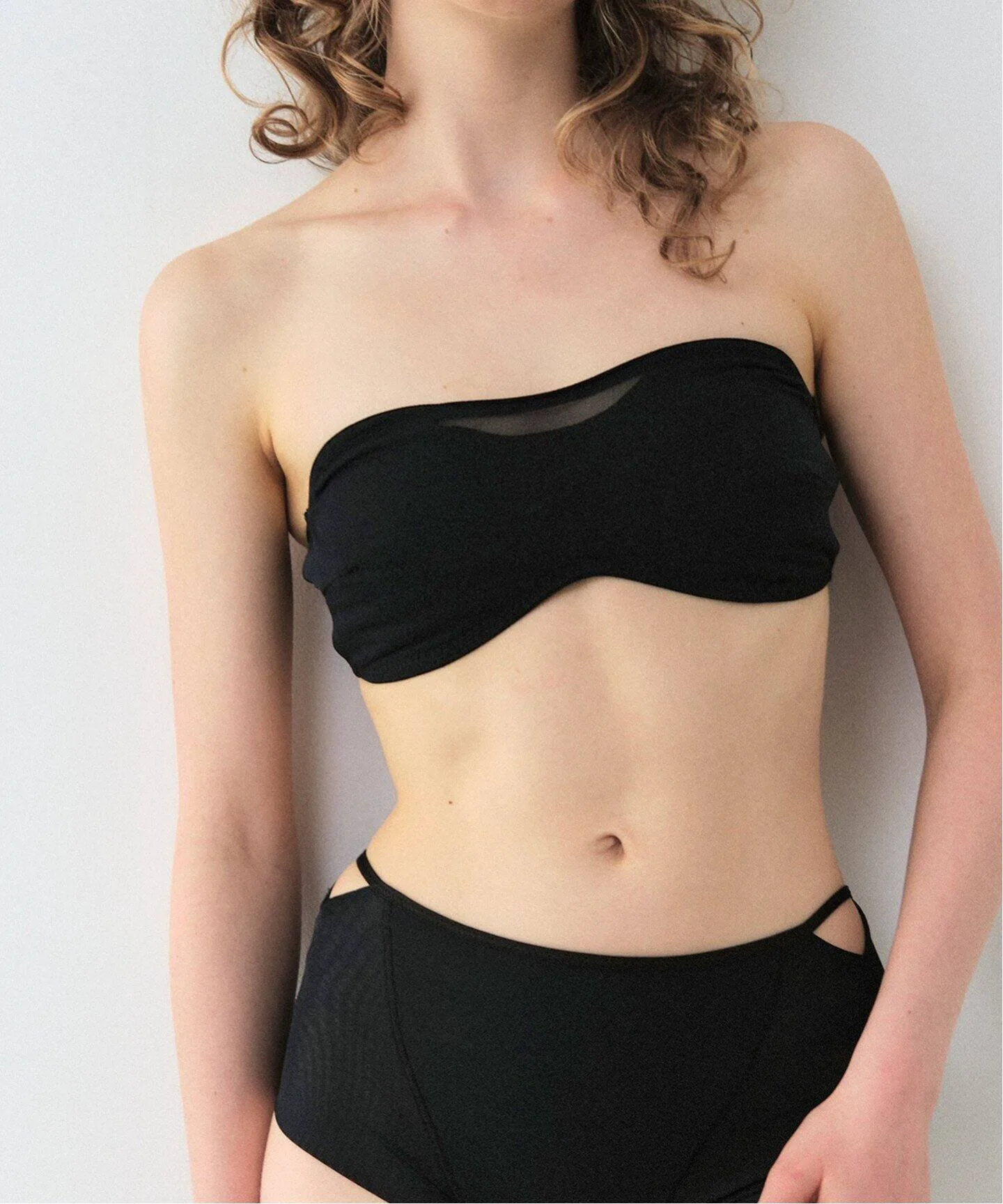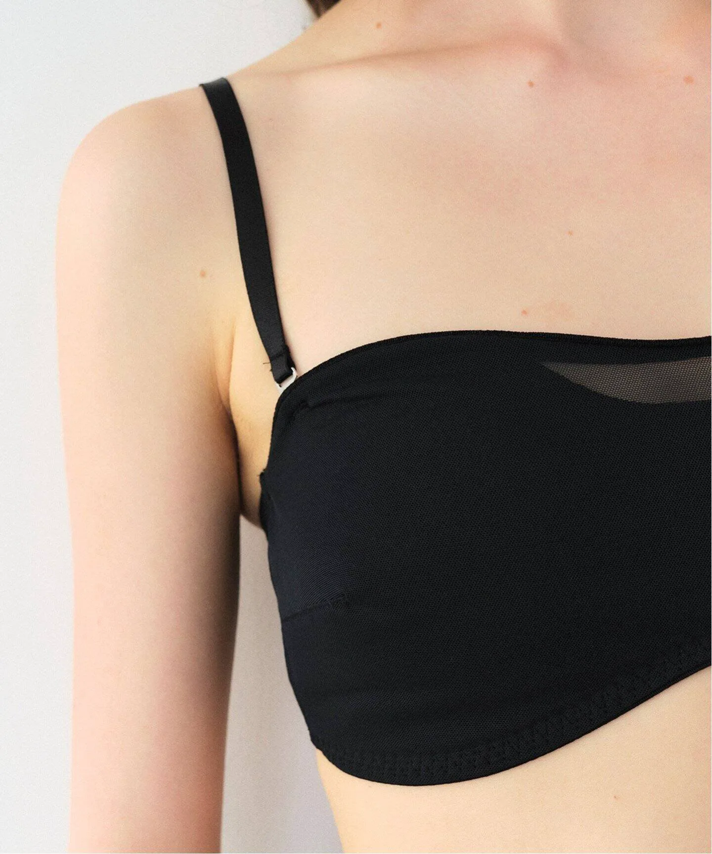 Бюстгальтер-бандо изготовлен из прозрачной сетчатой ткани.