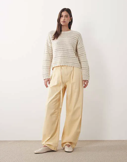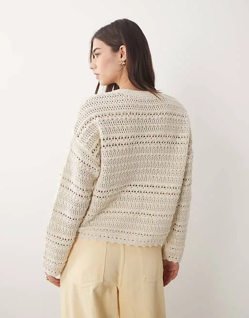 Особое внимание уделено деталям: вязаный узор, выполненный крючком, придает джемперу уникальный вид и добавляет нотку ручной работы. Этот узор является ключевым элементом дизайна в стиле бохо, который ассоциируется с творчеством и индивидуальностью. Ребристая отделка на манжетах и по нижнему краю джемпера обеспечивает идеальную посадку и добавляет текстурный контраст.