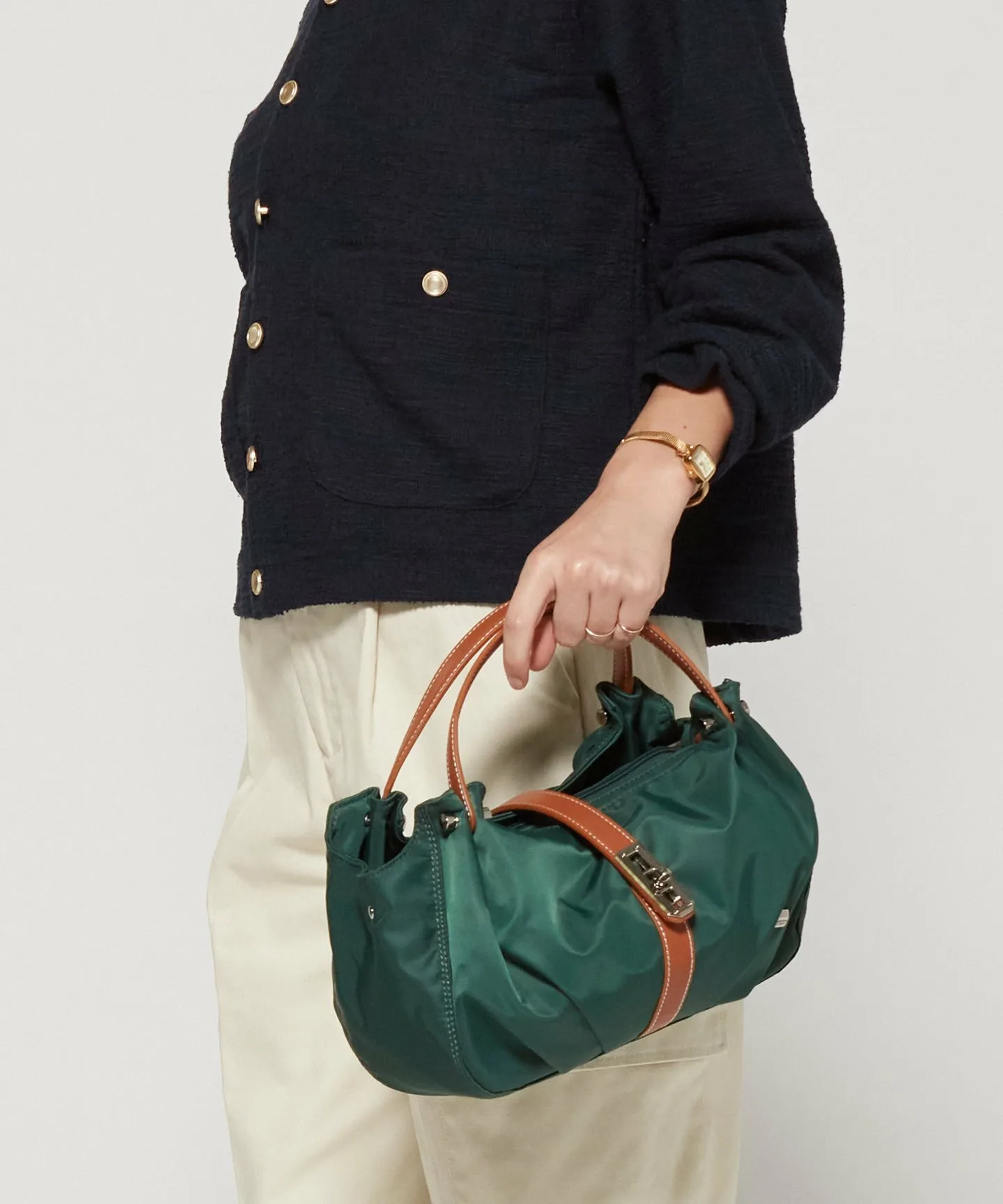 Закругленный силуэт этой сумочки добавит милый акцент вашему образу.