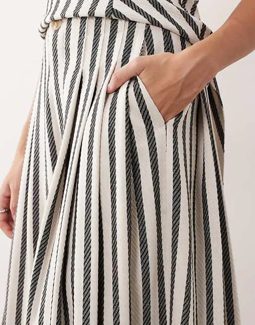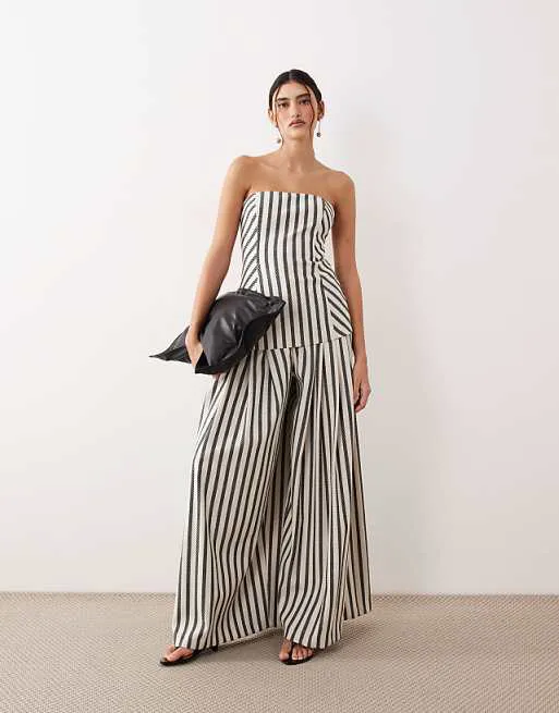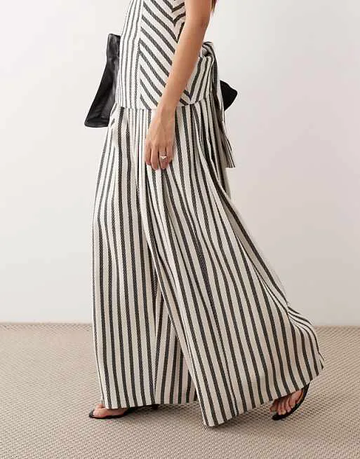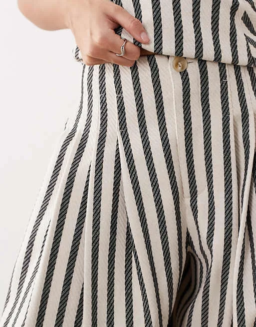 Брюки выполнены в классическом стиле палаццо, что обеспечивает свободу движений и комфортную посадку. Широкие штанины создают эффектный силуэт, который визуально удлиняет ноги и придает образу легкость. Полосатый принт добавляет изделию динамичности и делает его более выразительным. Складки по центру брюк подчеркивают элегантность модели и добавляют ей изысканности. Практичные боковые карманы обеспечивают удобство и функциональность.