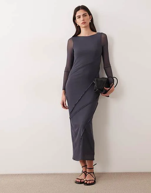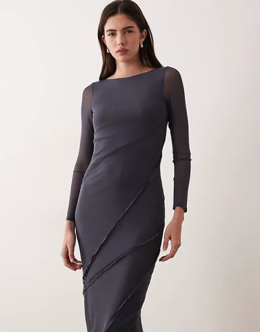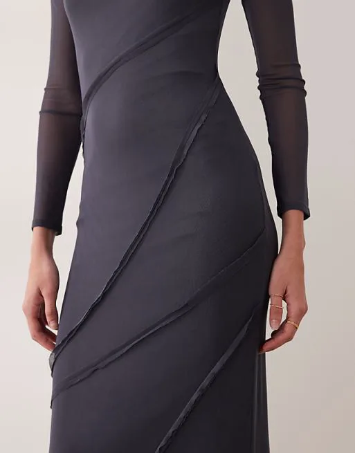 Особенностью данной модели являются открытые декоративные швы, которые добавляют оригинальности и подчеркивают индивидуальность. Рукава из прозрачной сетки придают образу легкость и женственность, делая его более утонченным. Платье имеет приталенный крой, который выгодно подчеркивает фигуру, создавая элегантный силуэт.