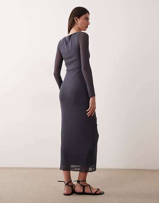 Платье выполнено из мягкого и эластичного трикотажа – джерси. Этот материал обеспечивает комфорт при носке и позволяет платью идеально садиться по фигуре. Джерси обладает приятной текстурой, хорошо драпируется и не сковывает движений. Темно-серый цвет делает платье универсальным, позволяя легко сочетать его с различными аксессуарами и обувью.