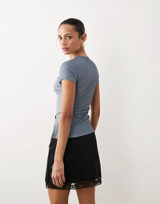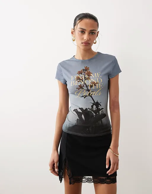 Топ имеет классический круглый вырез, который подчеркивает линию шеи и позволяет легко сочетать его с различными аксессуарами. Короткие рукава обеспечивают свободу движений и делают топ идеальным для теплой погоды или в качестве базового слоя под жакет или кардиган. Главной изюминкой топа является принт с текстом и графикой на груди, который добавляет образу индивидуальность и выразительность. Узкая посадка подчеркивает силуэт, создавая элегантный и современный вид.