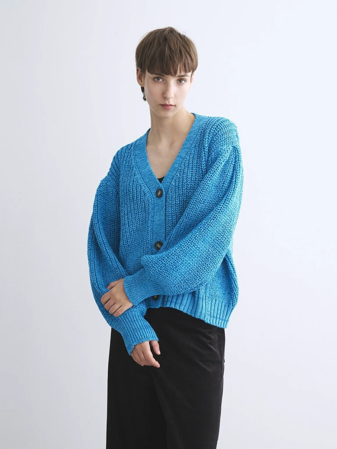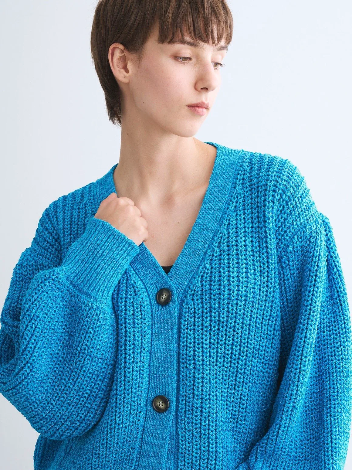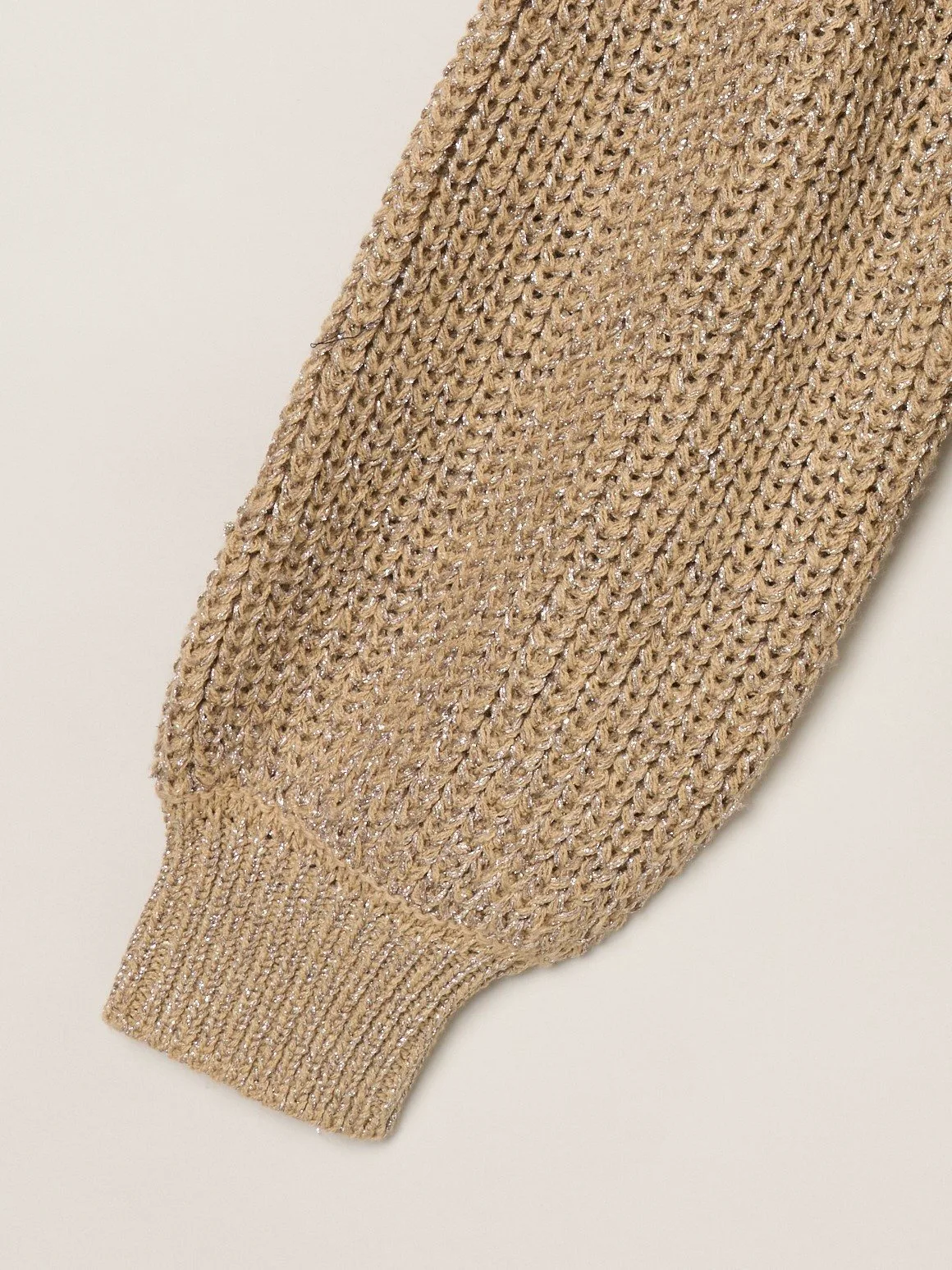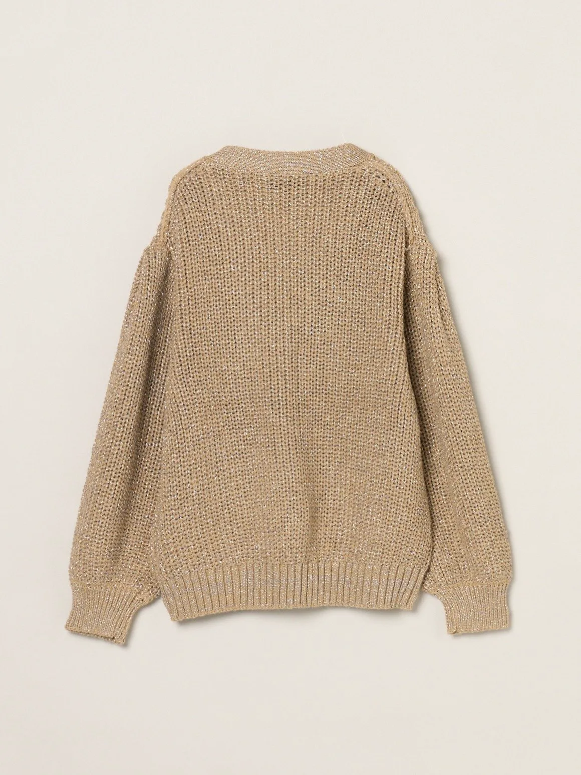 Кардиган из блестящей вязки, переливающийся на свету. Плотная вязка низкой толщины дополнена толстой блестящей пряжей. Просто сочетайте его с джинсами и топом, чтобы оживить свой образ. Складки на плечах добавляют объемный, современный штрих. Также доступен пуловер из того же материала.