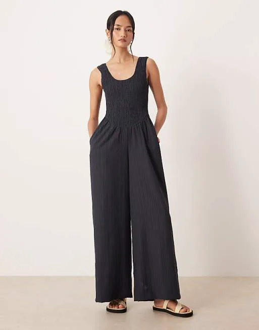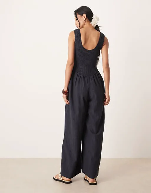 Комбинезон имеет вырез лодочкой, который подчеркивает изящность шеи и ключиц. Отсутствие рукавов придает образу легкость и позволяет носить его в теплое время года или сочетать с жакетами и кардиганами в прохладную погоду. Сборчатый, эластичный лиф обеспечивает комфортную посадку и подчеркивает силуэт. Широкие брючины добавляют образу элегантности и свободы, делая его идеальным для создания как повседневных, так и вечерних образов. Классический крой комбинезона гарантирует универсальность и позволяет легко комбинировать его с различными элементами гардероба.