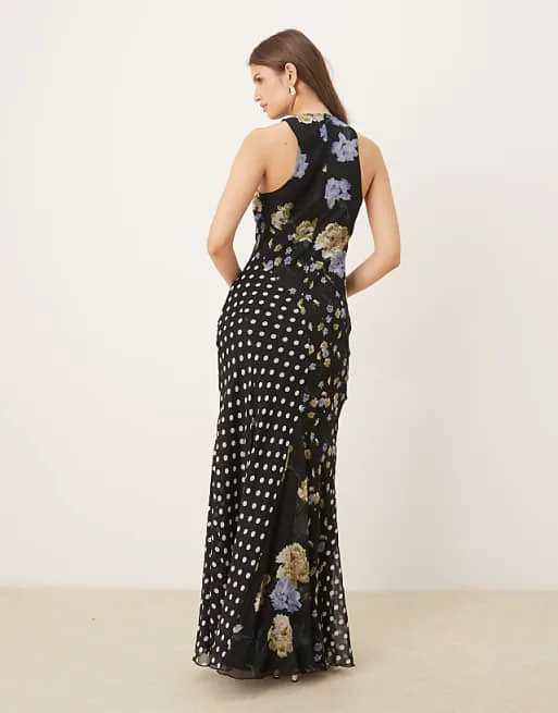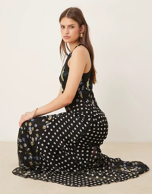 Дизайн платья продуман до мелочей. Смещенный воротник-борцовка придает образу изящность и легкость, а подол в виде годе добавляет динамики и делает силуэт более выразительным. Цветочный принт с горошком – это классическое сочетание, которое всегда актуально и привлекательно. Он придает платью романтичный и свежий вид, делая его идеальным для различных мероприятий.