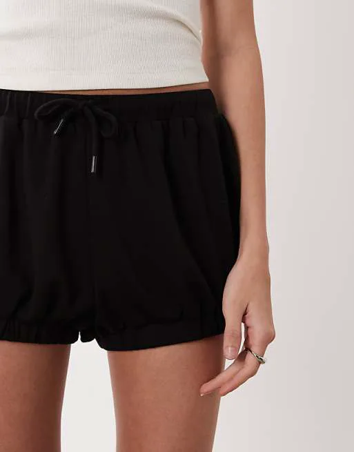 Шорты выполнены в классическом черном цвете, который легко сочетается с любым верхом. Простой, но элегантный дизайн делает их универсальными для различных образов. Низкая посадка обеспечивает комфортную посадку на талии, а эластичный пояс со шнурком позволяет регулировать посадку по фигуре.