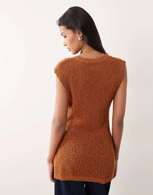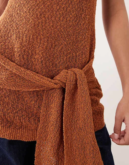 Топ выполнен в насыщенном рыжем цвете, который придает образу яркость и выразительность. Круглый вырез горловины подчеркивает шею и ключицы, добавляя нотку женственности. Отсутствие рукавов делает топ идеальным выбором для теплой погоды или для создания многослойных образов. Завязывающийся на узел дизайн позволяет регулировать посадку по фигуре, подчеркивая талию и создавая привлекательный силуэт. Удлиненный крой добавляет изделию современный вид, а классический силуэт делает его универсальным.