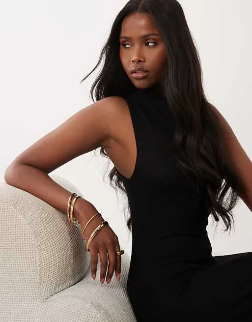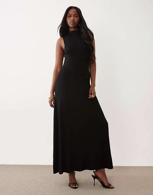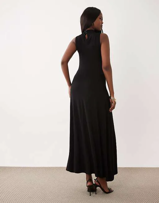 Платье выполнено в классическом черном цвете, который всегда актуален и уместен в любой ситуации. Высокий воротник добавляет образу нотку элегантности и утонченности, делая его идеальным выбором как для повседневной носки, так и для особых случаев. Отсутствие рукавов придает платью легкость и изящество, позволяя вам чувствовать себя комфортно в теплую погоду или сочетать его с различными аксессуарами, такими как жакеты или кардиганы.