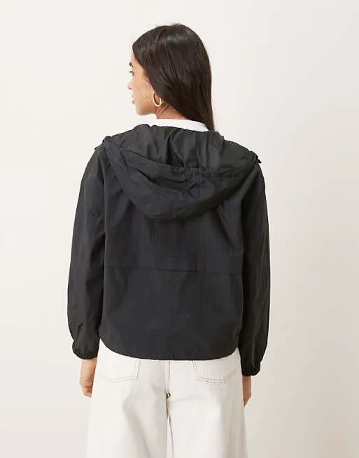 Ветровка выполнена в классическом черном цвете, который легко сочетается с любой одеждой. Капюшон на шнурке обеспечивает дополнительную защиту от ветра и дождя, а высокий воротник надежно защищает шею. Застежка-молния позволяет быстро и удобно надевать и снимать ветровку, а также регулировать степень защиты от непогоды.