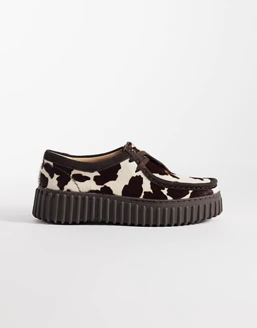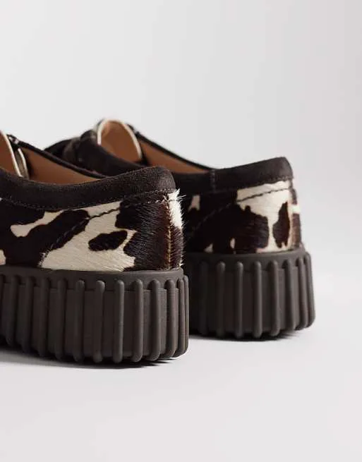 Верх туфель выполнен из высококачественной кожи с текстурированной поверхностью, украшенной коровьим принтом. Этот смелый и оригинальный дизайн делает обувь запоминающейся и привлекает внимание. Шнуровка обеспечивает надежную фиксацию на ноге, а фирменный логотип Clarks подчеркивает премиальное качество изделия.