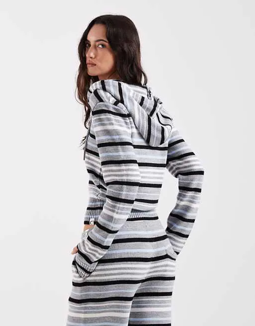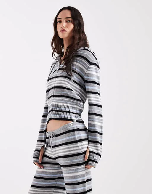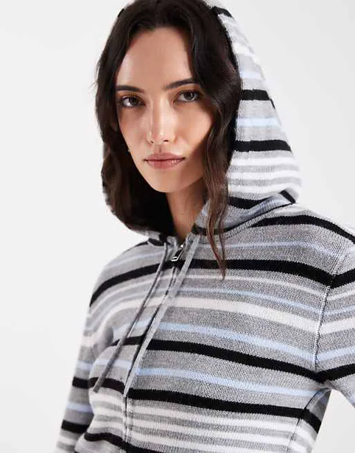 Дизайн худи выделяется благодаря сочетанию серо-синего цвета и полосатого принта, что придает ему оригинальность и делает его заметным. Короткий крой добавляет современный акцент, подчеркивая фигуру и позволяя создавать интересные сочетания с другой одеждой.