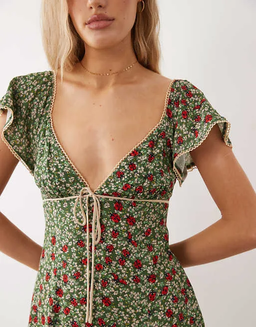 Платье имеет привлекательный V-образный вырез, который визуально удлиняет шею и подчеркивает зону декольте. Завязка спереди позволяет регулировать глубину выреза и добавляет игривый акцент. Рукава-крылышки придают образу легкость и воздушность, а также обеспечивают дополнительный комфорт в жаркую погоду. Сборчатая эластичная вставка на спинке обеспечивает идеальную посадку по фигуре, подчеркивая талию и создавая женственный силуэт. Классический крой платья делает его универсальным и подходящим для различных типов фигур.