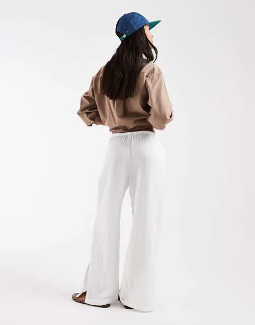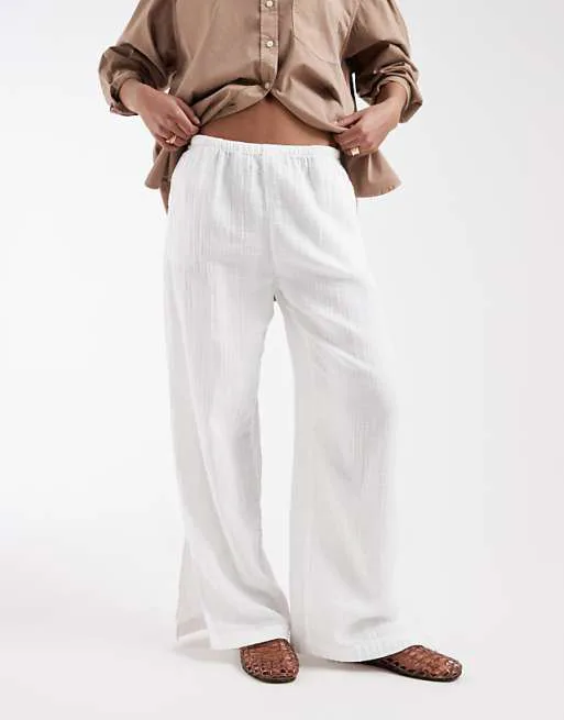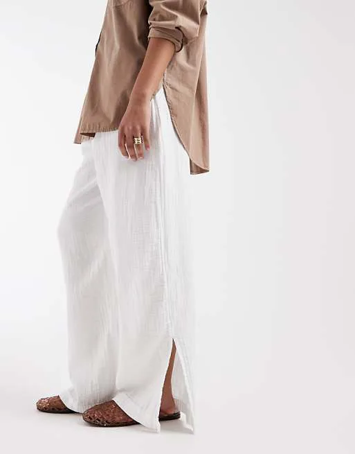 Дизайн брюк продуман до мелочей. Эластичная резинка на поясе обеспечивает идеальную посадку по фигуре, не сковывая движений и создавая ощущение комфорта. Боковые разрезы добавляют образу легкости и изящества, визуально удлиняя ноги и придавая походке непринужденность. Широкие штанины создают эффект воздушности, позволяя коже дышать и обеспечивая максимальный комфорт.