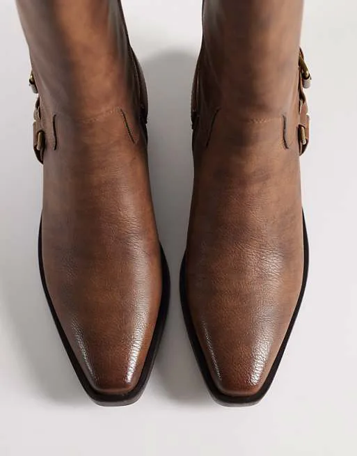 Для удобства надевания предусмотрены специальные петли, расположенные в верхней части голенища. Застежка с пряжкой на заднике не только выполняет декоративную функцию, но и позволяет регулировать посадку ботинка по ноге. Узкий носок добавляет изящности, а квадратный каблук обеспечивает устойчивость и комфорт при ходьбе.
