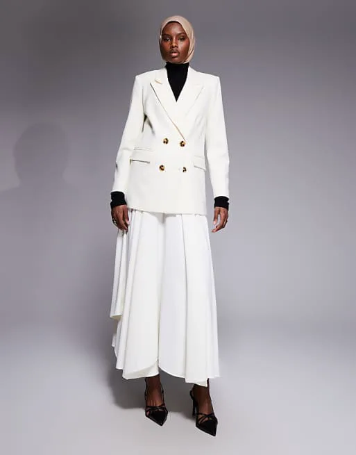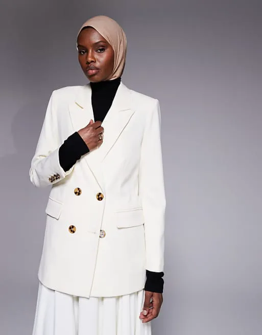 Пиджак выполнен в свободном, оверсайз силуэте, что обеспечивает комфорт и свободу движений. Двубортный крой придает изделию изысканность и подчеркивает элегантность. Пиковые лацканы добавляют образу нотку формальности и стиля. Застежка на пуговицы обеспечивает надежную фиксацию, а манжеты на пуговицах позволяют регулировать ширину рукава.