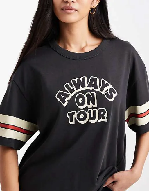 Дизайн футболки вдохновлен духом путешествий и музыкальных туров, что отражено в оригинальном принте. Эта футболка станет отличным выбором для тех, кто ценит комфорт, стиль и индивидуальность. Она легко сочетается с различными элементами гардероба, позволяя создавать разнообразные образы.