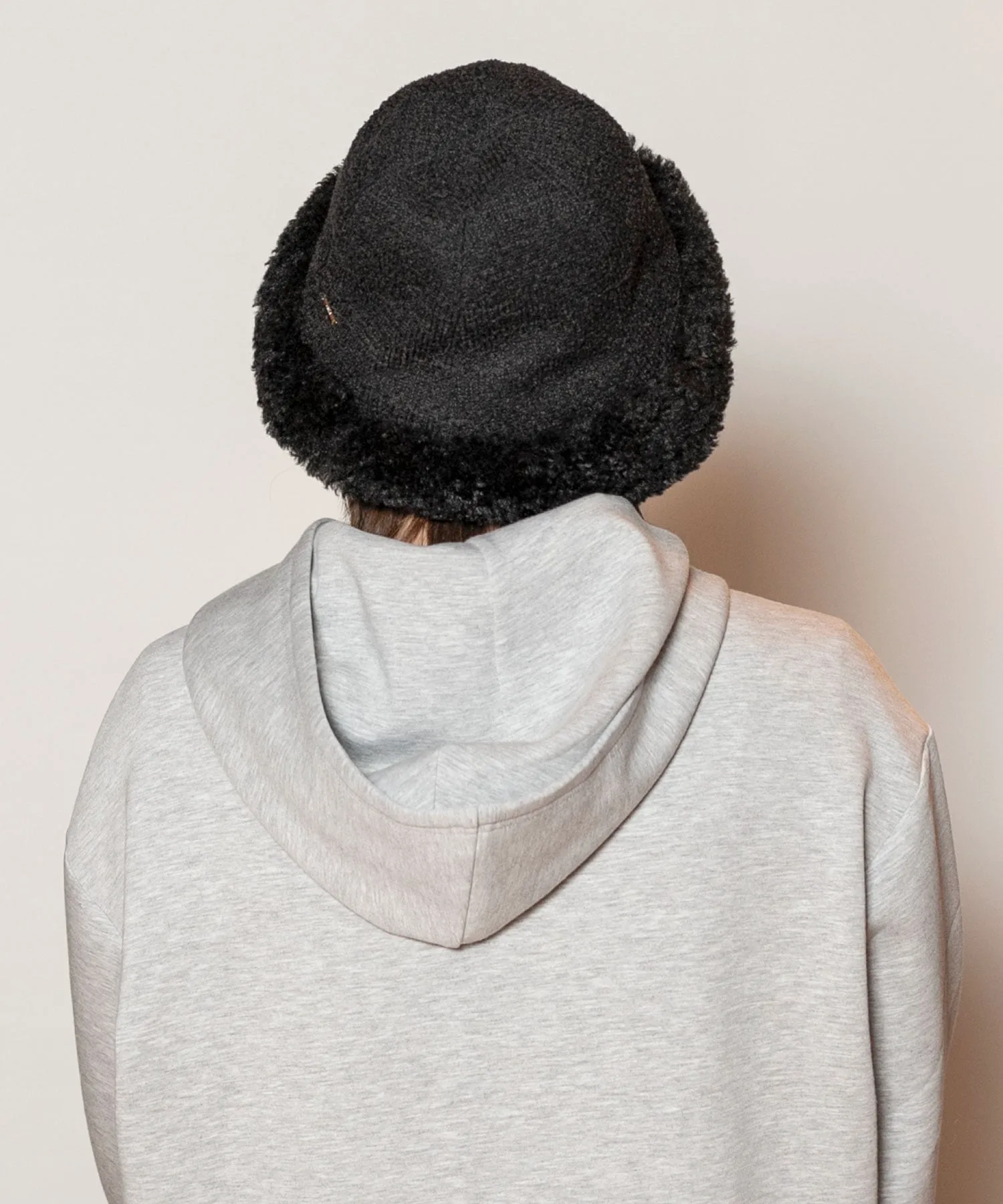 Тулина изготовлена из твида, а поля — из меха, имитирующего овчину. Она имеет эффектную, но при этом легкую отделку.