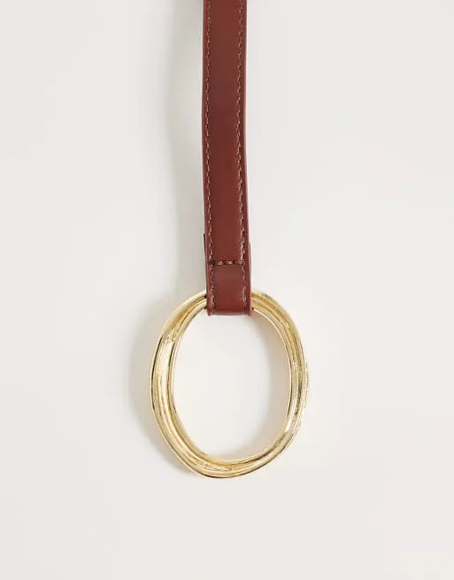 Одной из ключевых особенностей ремня является пряжка с золотистым покрытием. Этот элемент добавляет нотку роскоши и изысканности, привлекая внимание и делая образ более выразительным. Золотистый цвет пряжки гармонично сочетается с коричневым цветом ремня, создавая стильный и завершенный образ.
