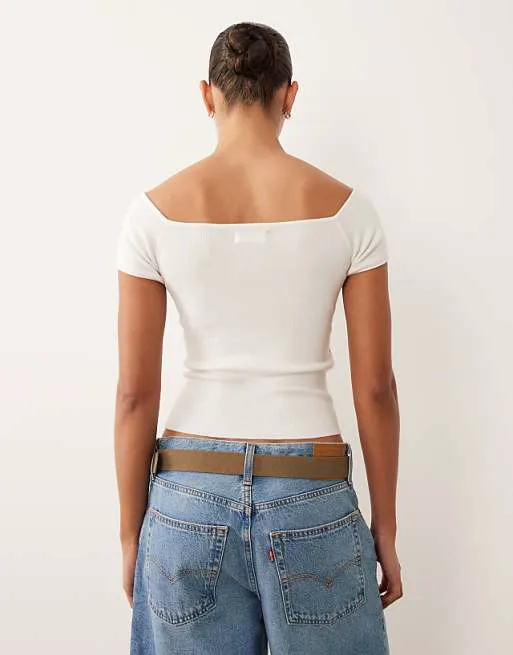 Дизайн топа отличается простотой и изысканностью. Асимметричный вырез добавляет оригинальности, подчеркивая плечи и создавая привлекательный силуэт. Короткие рукава обеспечивают свободу движений и комфорт в теплую погоду. Приталенный крой выгодно подчеркивает фигуру, делая образ более женственным и утонченным.