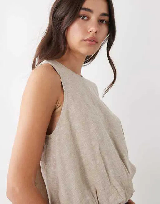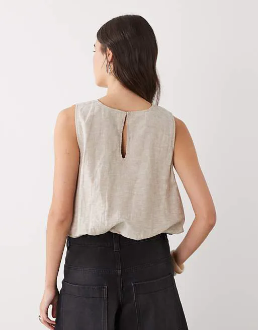 Дизайн топа продуман до мелочей. Круглый вырез горловины подчеркивает изящность шеи, а открытая спинка с декоративной застежкой-каплей добавляет образу женственности и изысканности. Отсутствие рукавов делает топ идеальным вариантом для лета, позволяя коже дышать и обеспечивая свободу движений. Эффект пузырей, созданный благодаря особому крою и обработке ткани, придает топу оригинальность и делает его заметным.