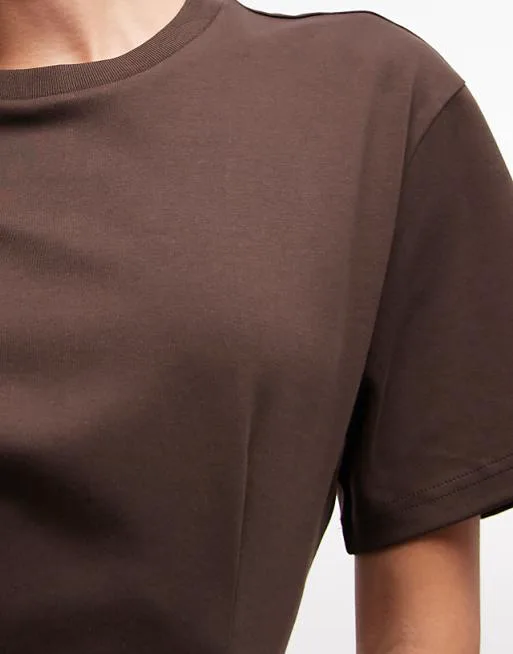 Представляем вашему вниманию элегантное мини-платье-футболку шоколадного оттенка, которое станет прекрасным дополнением вашего гардероба. Это платье сочетает в себе комфорт повседневной футболки и изысканность платья, что делает его идеальным выбором для различных случаев.